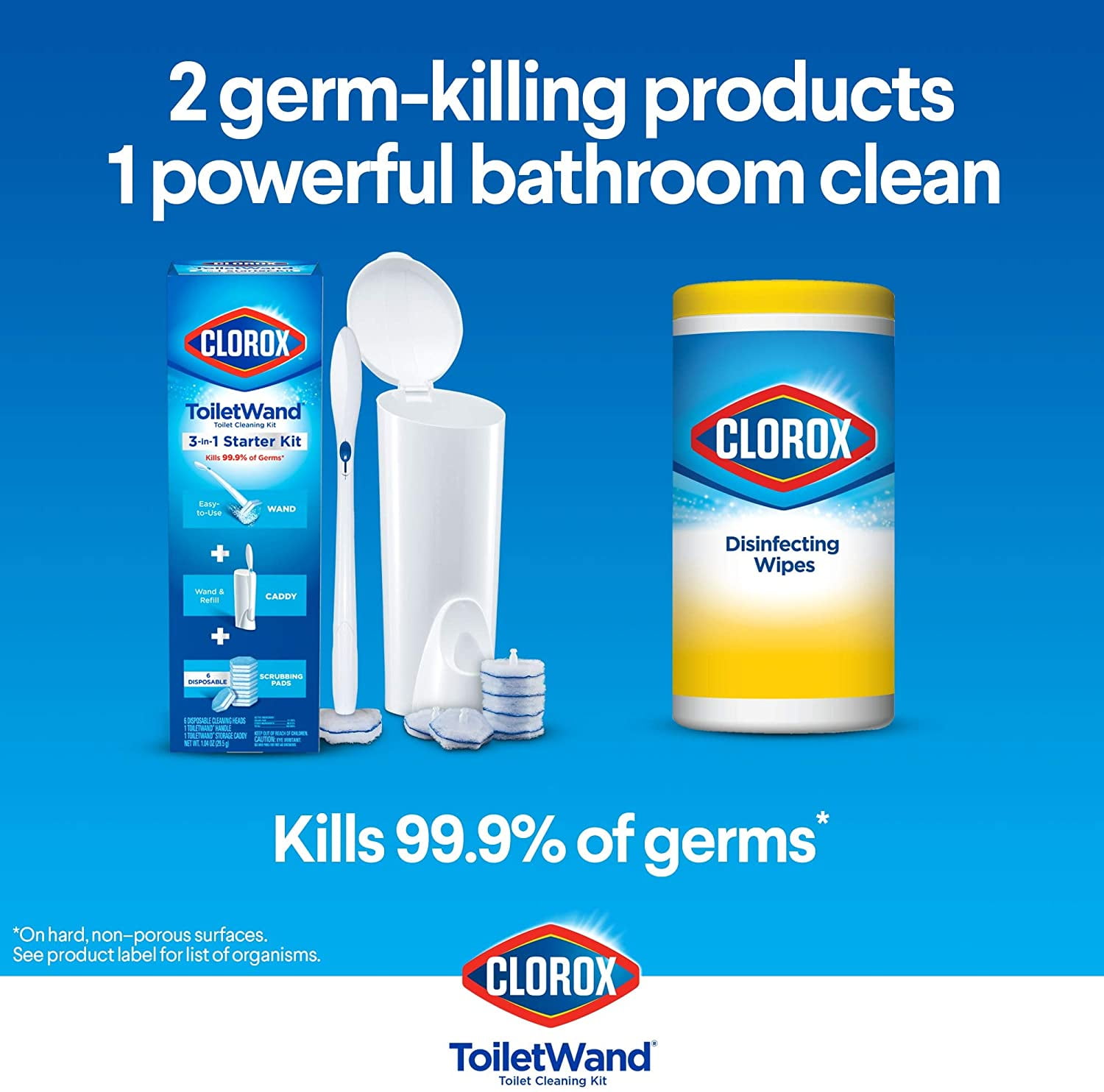 Clorox Toilet Wand disposable toilet Cleaning system is a convenient way to a quick clean toilet. The starter kit contains one wand, 6 original refills, 10 Rainforest rush scented refills and 1 storage Caddy to get you started on a deeper clean. Each disposable head is preloaded with Clorox cleaner with 4x the powerful scrubbing action to clean tough stains, kill germs, remove rust, calcium and limescale while it disinfects and deodorizes with ease. Based on comparative lab tests, the toilet wand cleans better than a brush. The sponge like cleaning head is shaped so that you can get into every nook and cranny needing cleaning and germ control while killing 99.9% of germs like Staphylococcus aureus, Salmonella enteria, rhinovirus type 37 and Influenza A. This all in one system is designed so that you get a brand new cleaning sponge every time you clean without having to touch a yucky brush. Just click your way to a cleaner toilet with the Clorox Toilet Wand disposable toilet Cleaning starter kit.How to use:Empty Toilet bowl before cleaning.Open Pouch of disposable cleaning heads.Push Handle straight down onto cleaning head until it clicks into place.Dip Cleaning head in toilet bowl water for 1-2 seconds.Scrub Entire toilet bowl above water line.Let Stand For 5 minutes to sanitize, 10 minutes to disinfect.Hold Wand over trash bin and slide button forward to release.??Toilet Cleaning system: add this toilet bowl Cleaner to your cleaning supplies includes 1 toilet wand, 1 storage Caddy, 6 original disposable refills plus 10 Rainforest rush scented refills that kill 99.9% of bacteria and viruses; packaging may vary | Disposable sponges: these toilet scrub pad refill heads click onto the toilet wand to Swish, scrub and clean The toilet bowl and conveniently pop off to throw in the trash | Disinfecting cleaner: preloaded with Clorox cleaner, these disposable scrubbing pads deep clean and remove stains while eliminating germs to make your toilet bowl feel like New | Bathroom cleaning products: eliminate the need to store a dirty, germ-ridden toilet brush with the convenient caddy that stores your toilet wand and refill heads for an all-in-1 bathroom household cleaner | Toilet scrubber: the hexagon shaped sponge heads clean in hard to reach places under the bowl rim and drain for a deeper and faster clean to remove rust, calcium and lime stains