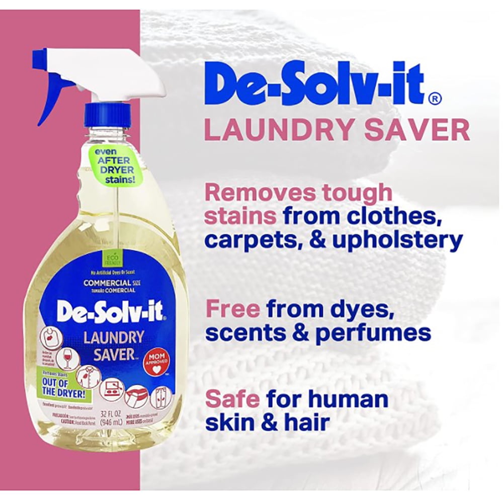 De-Solv-it Laundry Saver removes stains from clothing once thought as ruined. Tackles tough stains even after the dryer, and an excellent prewash for baby stains, blood, grease and even mustard. No artificial dyes or perfumes, biodegradable and Mom Approved?. Economical 32oz spray.Removes tough clothing stains even after the dryer. Excellent prewash too. Mom Approved? and Biodegradable.