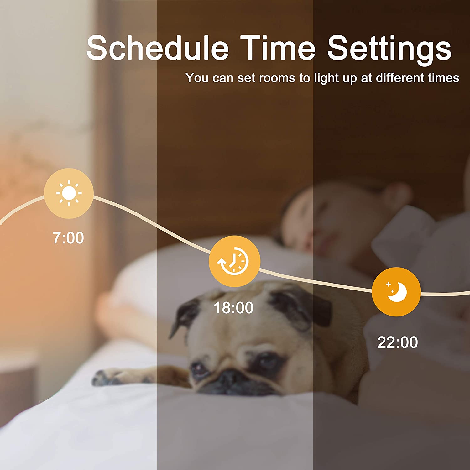 - Schedule Settings: Schedule the smart bulbs automatically on/off via the Smart Life APP. Turn it on before you wake up and turn it off after you fall asleep. And you can set rooms to light up at different times. Never worry whether you’ve left any lights on