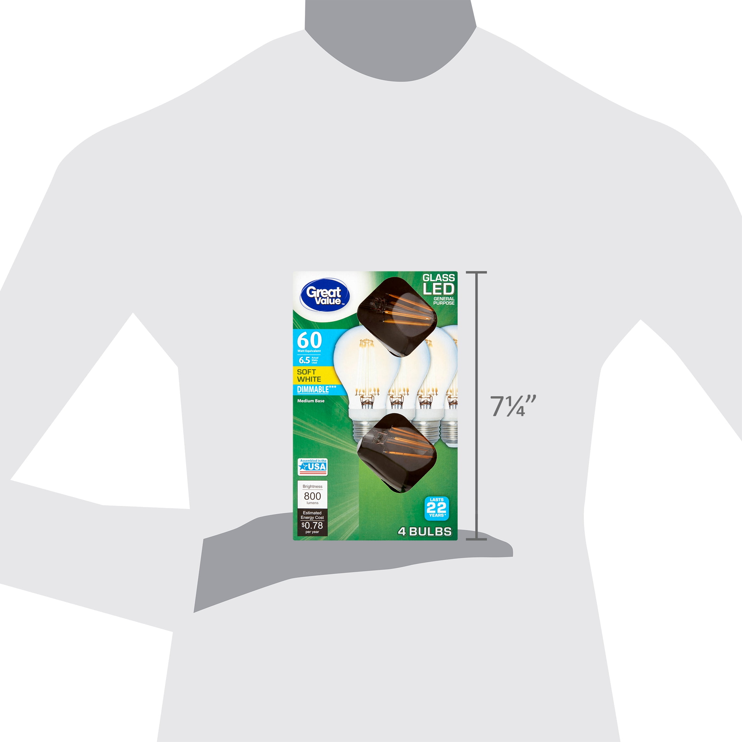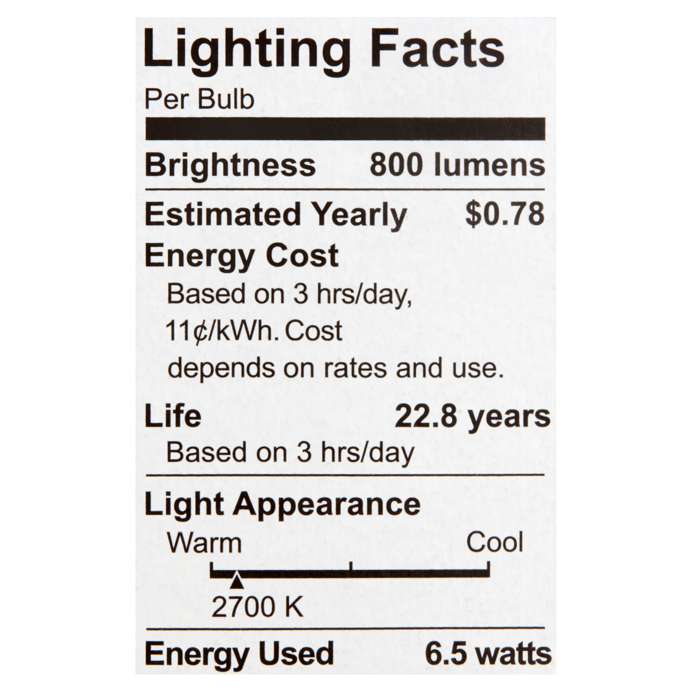 Modernize your lighting while enjoying incredible savings with Great Value LED Glass 6.5 Watts Soft White Medium Base Bulbs. Our glass LED light bulbs have a brightness of 800 lumens and are equivalent to traditional 60-watt light bulbs, making them ideal for general purpose lighting throughout your home and outdoors. By only using 6.5 watts of energy, this light bulb can last for 25,000 hours; that’s 13 years of life, based on an average of 3 hours of use per day! It’s a bright idea to replace your incandescent bulbs with Great Value LED Glass 6.5 Watts Soft White Medium Base Bulbs.