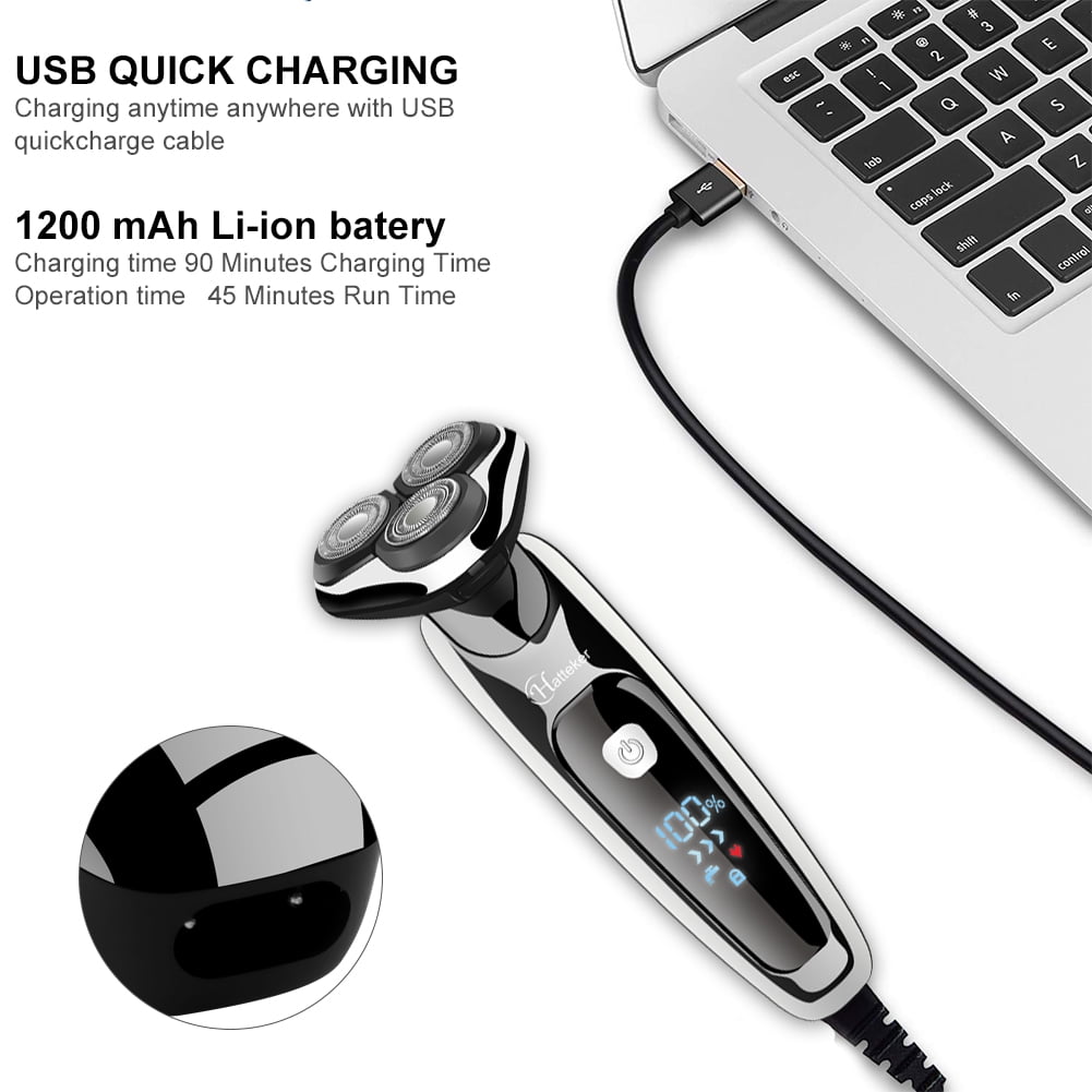 - USB QUICK-CHARGING & LED DISPLAY:Enjoy up to about 45 minutes continuously shaving (or approximately 30 full shaves). The shaver only requires 1.5 hour to charge and is very convenient for your daily and for travel