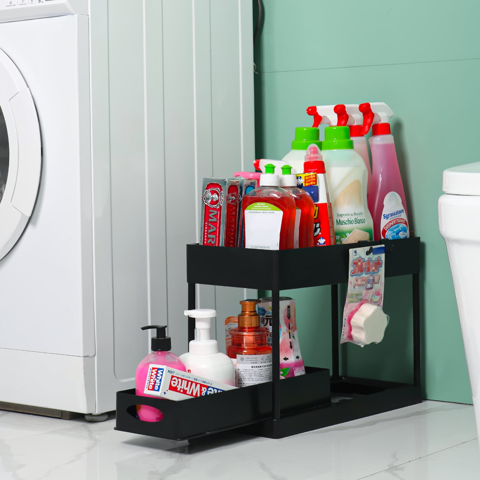 This under sink organizer is made of high quality ABS plastic. It has the characteristics of super toughness, Wear resistance, And durability. Double layer sink storage organizer is connected and supported with painted thickened forged steel body metal rods, Rust-proof and better form a stable structure to support heavy loads. Baskets with hollow design for good drainage.