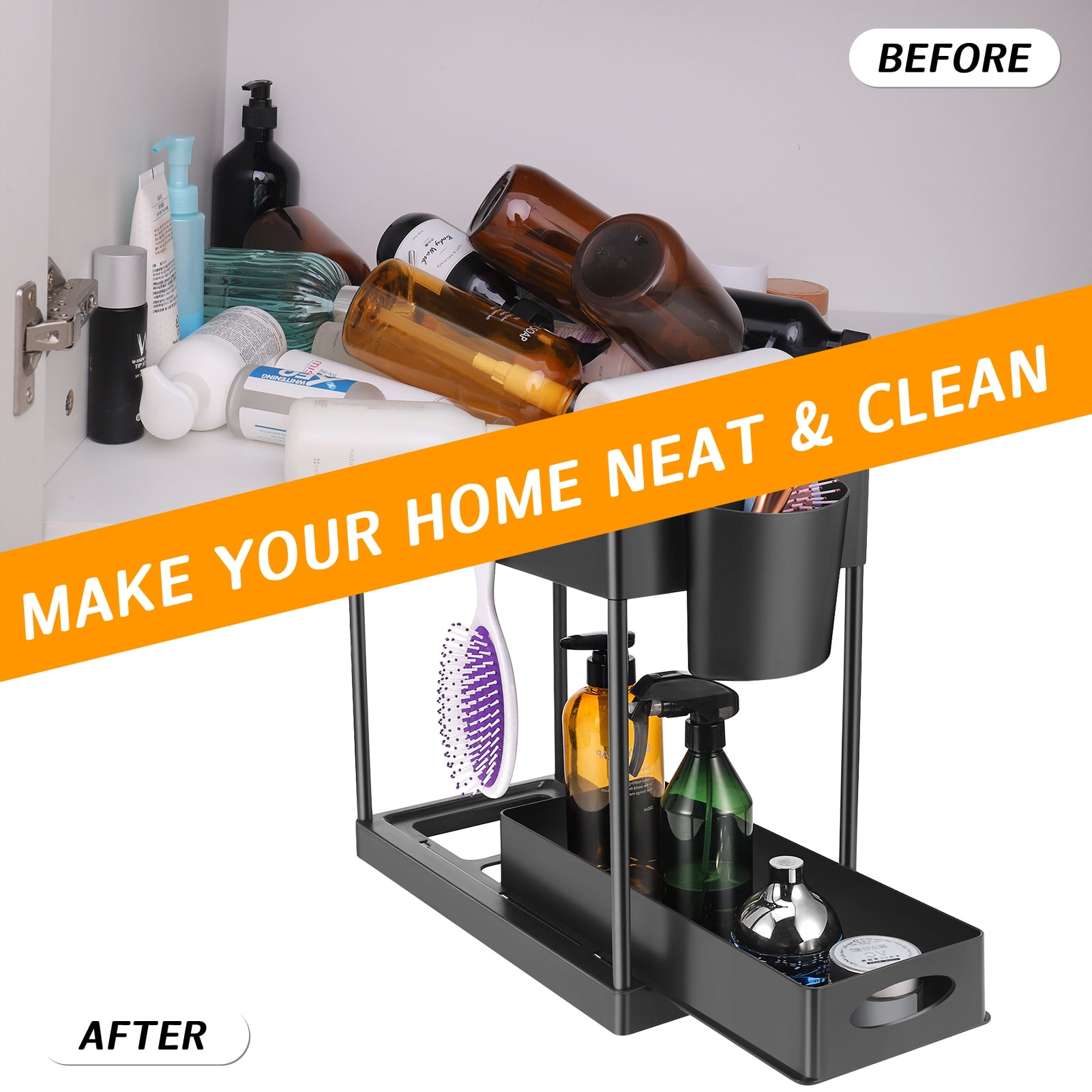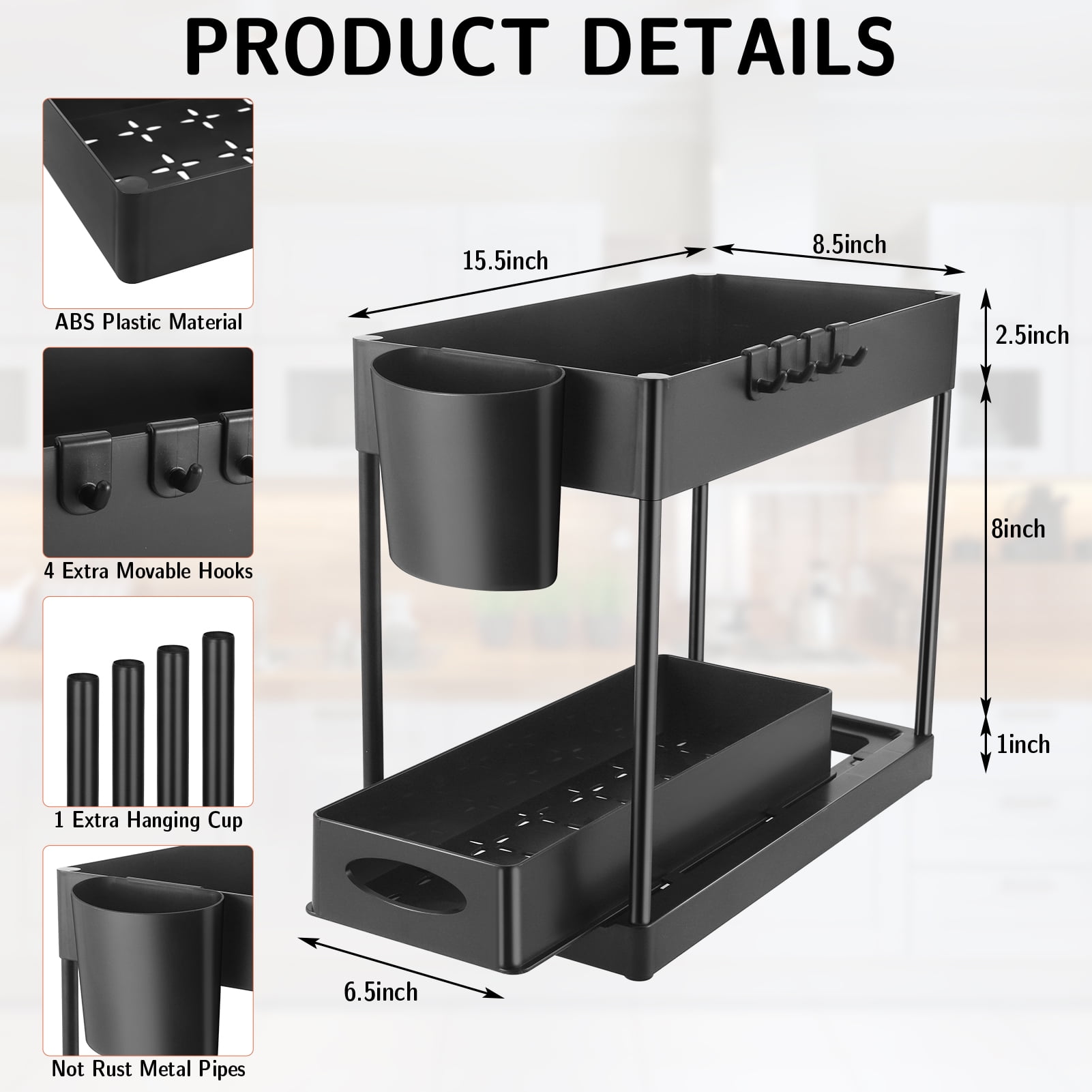 Accessories for under sink organizer: with 4 removable hooks, 1 removable hanging cup. You can hang more items on hooks, Or place them in hanging cups. It keeps your under-sink cabinets, Storage closets, Countertops and more more organized.