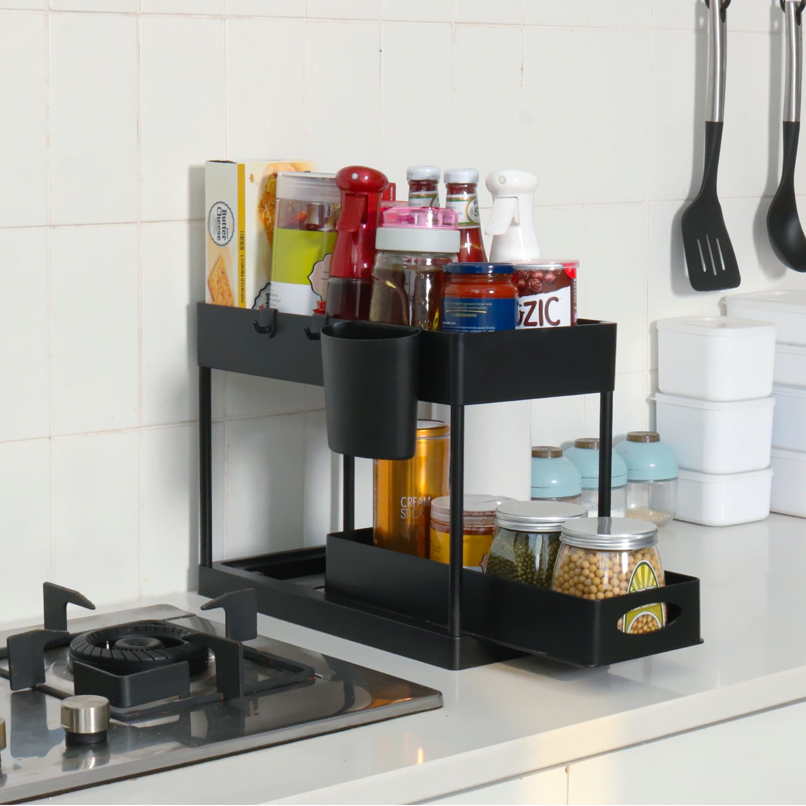 This 2 tier under sliding cabinet basket organizer adopts modern and simple style design can be matched well with most household style, And the proper size allows it to be easily placed in the sink, storage cabinet, or surface. So it can be used for many areas, like kitchen cabinets as a spice rack , pantry, living room as a cosmetic storage standing shelf so on.