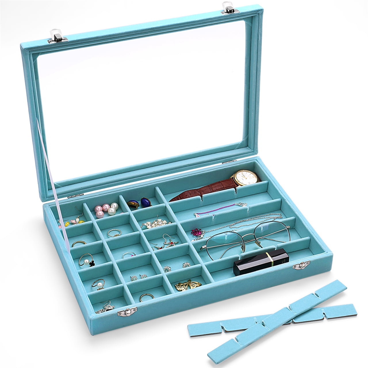 The removable dividers provide a maximum of 30 sectional compartments. You can adjust the dividers of different sizes as you needed. So you can organize earrings, rings, necklaces. For the Large Grid, you can storage bracelets, bangles, sunglasses, watches as you wanted.