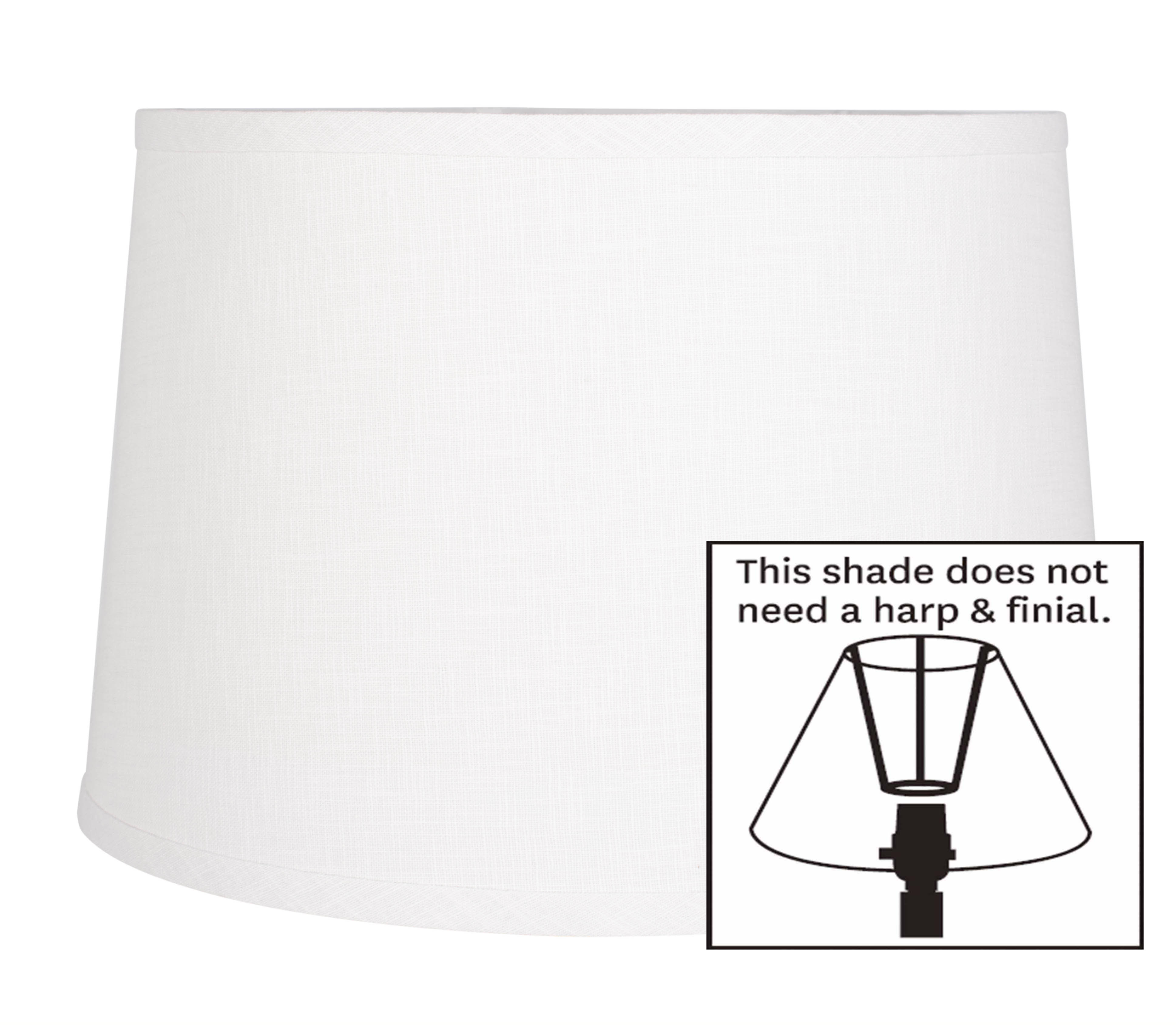 The Mainstays White Banded Shade can easily update the look of your new or existing lamp. The white texture color will freshen the style to your table lamp or pair it with another mix and match Mainstays lamp base. The Mainstays White Banded Shade features an Uno fitter, which eliminates the need for a harp and finial. Simply place shade on top of lamp base socket before the bulb. The Mainstays White Banded Shade is 13 inches tall and 15 inches in diameter that is reinforced with a hardback design to help maintain the shade’s shape. The Mainstays White Banded Shade complements a wide variety of décor schemes and is easy to match with most accent lamp bases. Add a decorative touch to any room in your home with this shade.