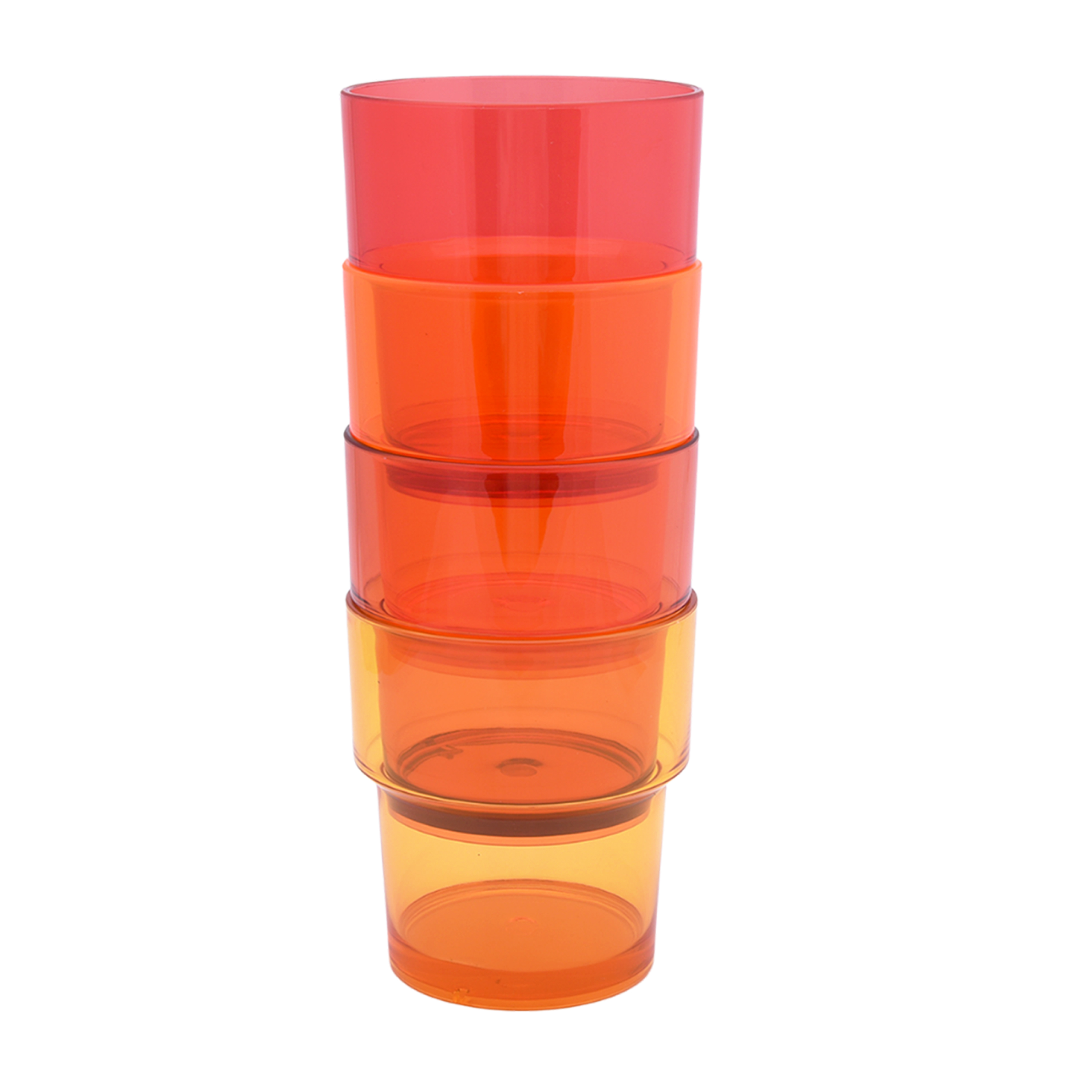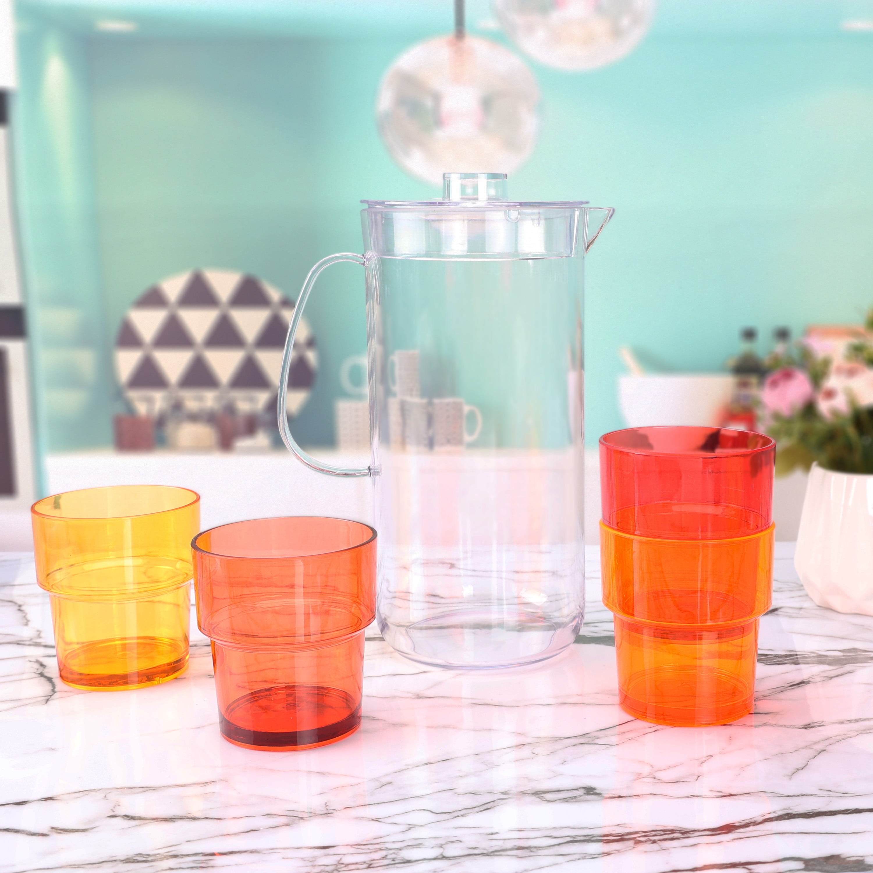 Serve your guests and family with a touch of style with this 4 pack Orange Stackable Tumbler Pitcher set. This pitcher and tumbler set are great for use on the patio, Summer parties, or everyday use. This item gives a unique style and texture with the durability and convenience. Add style to your drink or barware collection with the 14-ounce Tumblers and 3-Quart Pitcher. Made from durable Acrylic plastic, this pitcher and tumbler set is sure to impress while you’re entertaining or in everyday life. This 3-quart pitcher and 14-ounce tumblers are made from durable acrylic plastic that is shatter and impact resistant, making it ideal for family gatherings indoors or out. The glossy finish makes the Summer colors stand out. Add these unique pitcher and tumblers to your Summer collection today!
