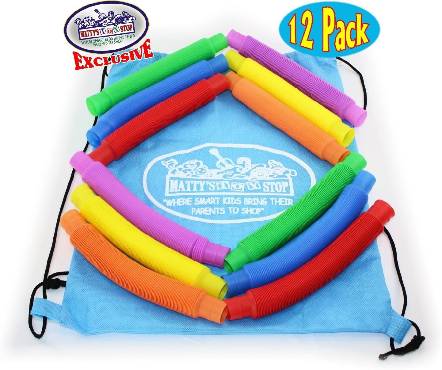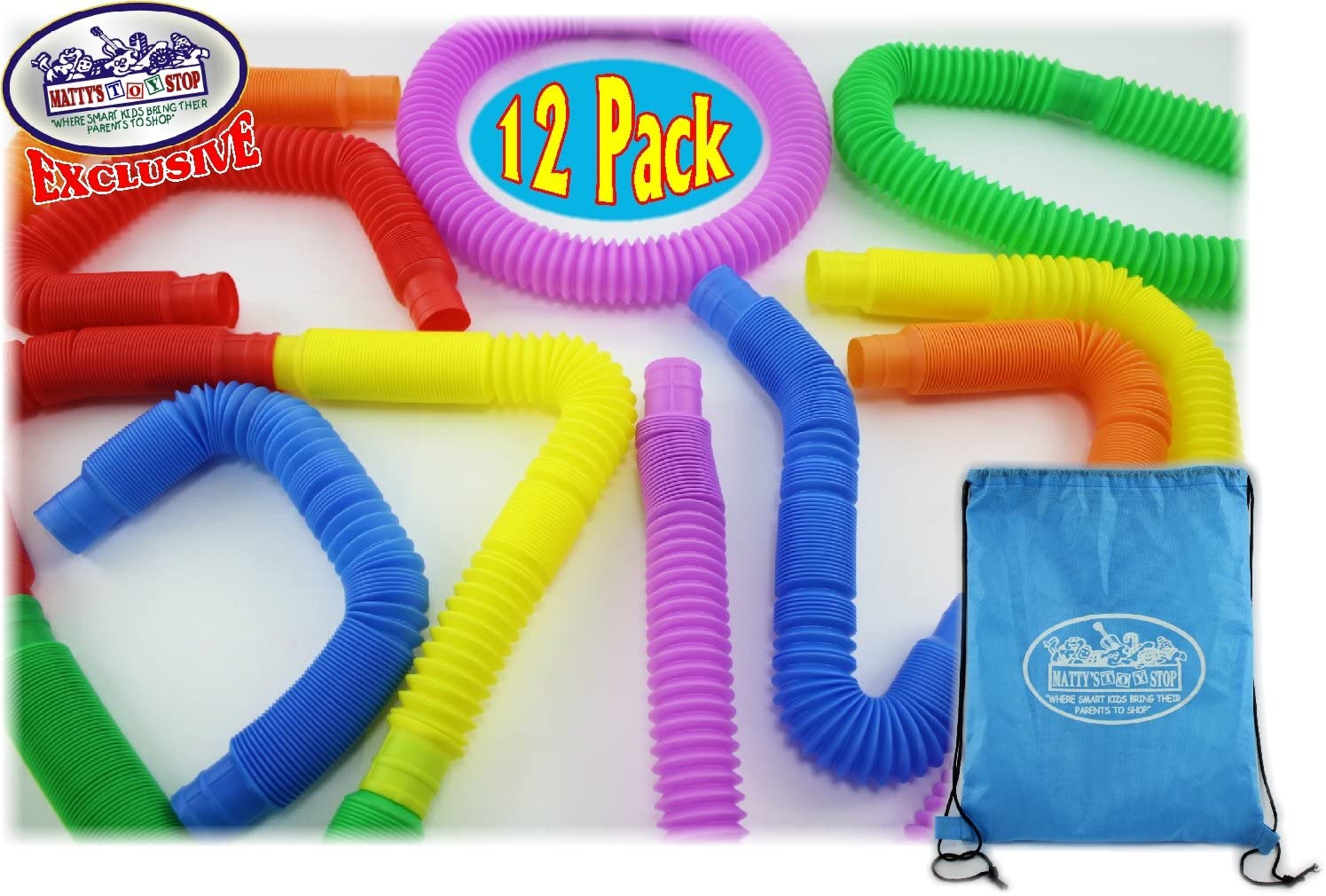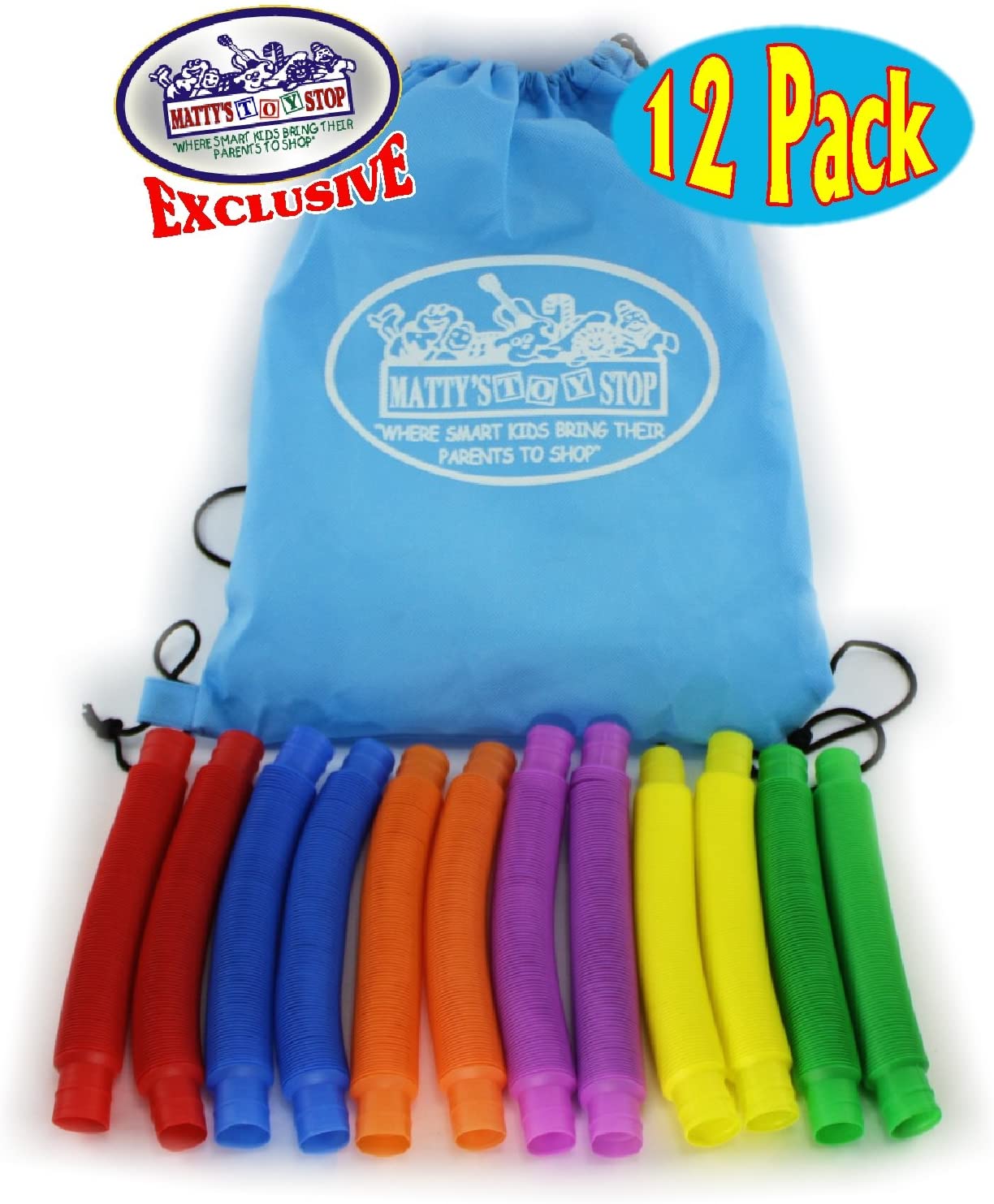 Mattys Toy Stop Pull N Pop Multi-color Tubes (Toobs) with Storage Bag – 12 Pack is AWESOME! Colors include red, blue, green, orange, yellow and purple. Snap, bend, pop, twirl and connect these awesome tubes! Provides tactile stimulation, fine motor skills and auditory feedback. Even better when used for hours of fun! Great for Special Needs, Occupational Therapy &Physical Therapy! Made of high quality plastic. Makes a great gift &is perfect for schools, party favors, stocking stuffers, baskets, special needs, promotions and so much more! For Ages 3 + – Tubes can expand from 8 to 27 – Storage bag included.