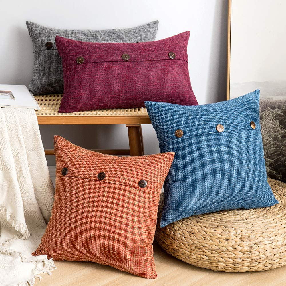 Linen Throw Pillow Covers Triple Button Burlap Solid Cushion Decorative Vintage Farmhouse Pillowcase