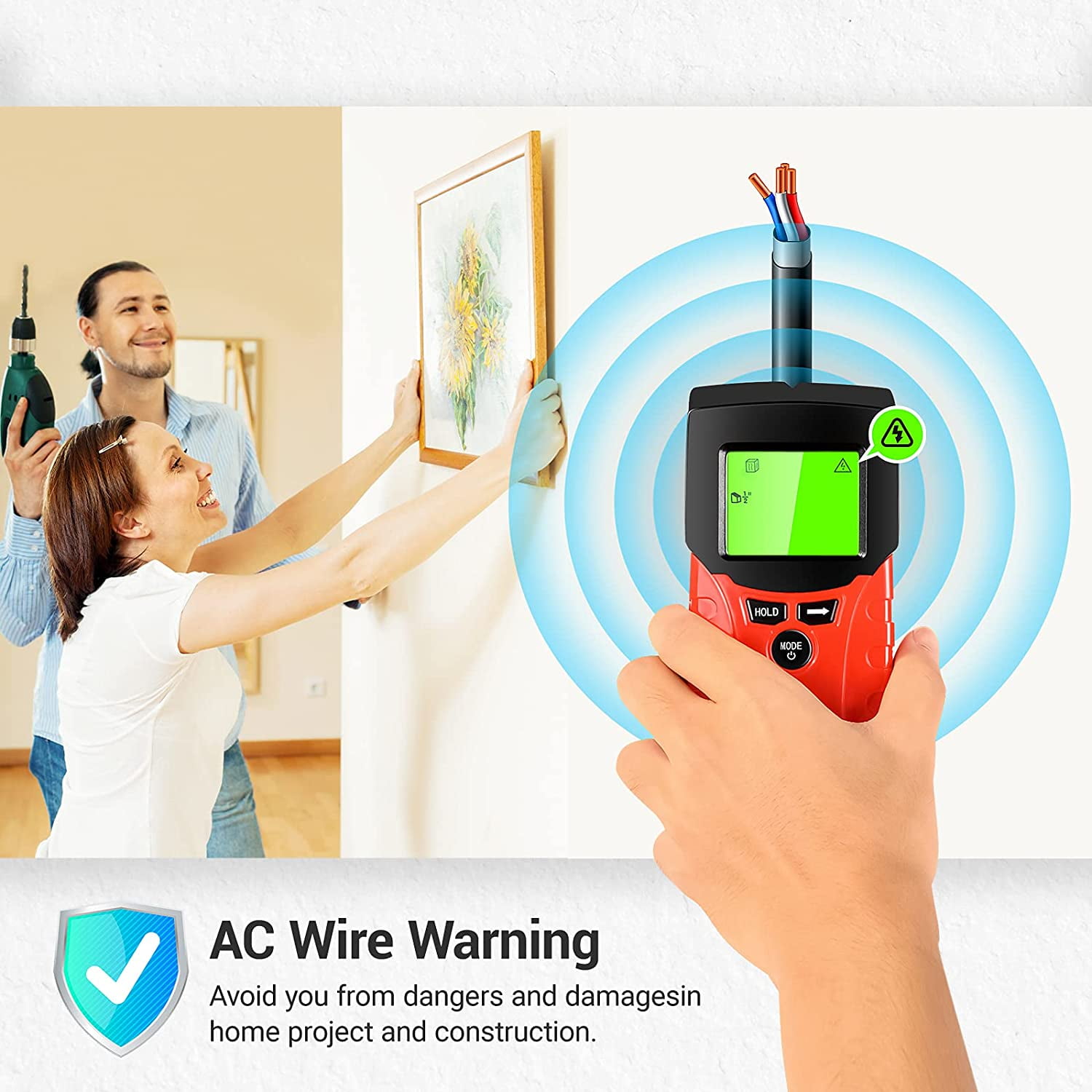 - 【AC Wires Warning】Our wall scanner will detect AC voltage in real time in any mode. When a voltage is present, an AC warning symbol will appear on the display to remind you to the presence of live AC wires, which helps you avoid danger when home renovation, mounting your TV, bathroom cabinet, photo frame, garage racks.
