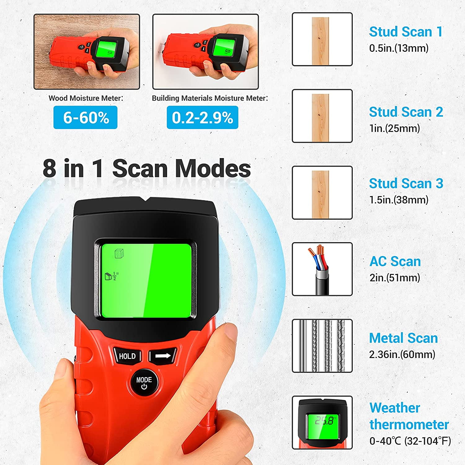 - 【8 in 1 Stud Finder & Moisture Meter】Our digital wall scanner has 8 scanning modes, Includes 1/2inch stud scan, 1inch stud scan, 1.5inch stud scan, 2.36inch metal scan, 2inch AC wires scan, Environment Thermometer(0-40℃), Wood humidity measuring and Building materials humidity measuring. More mode choices, whether you are a professional, a homeowner or a DIY enthusiast, will make your home projects easier.