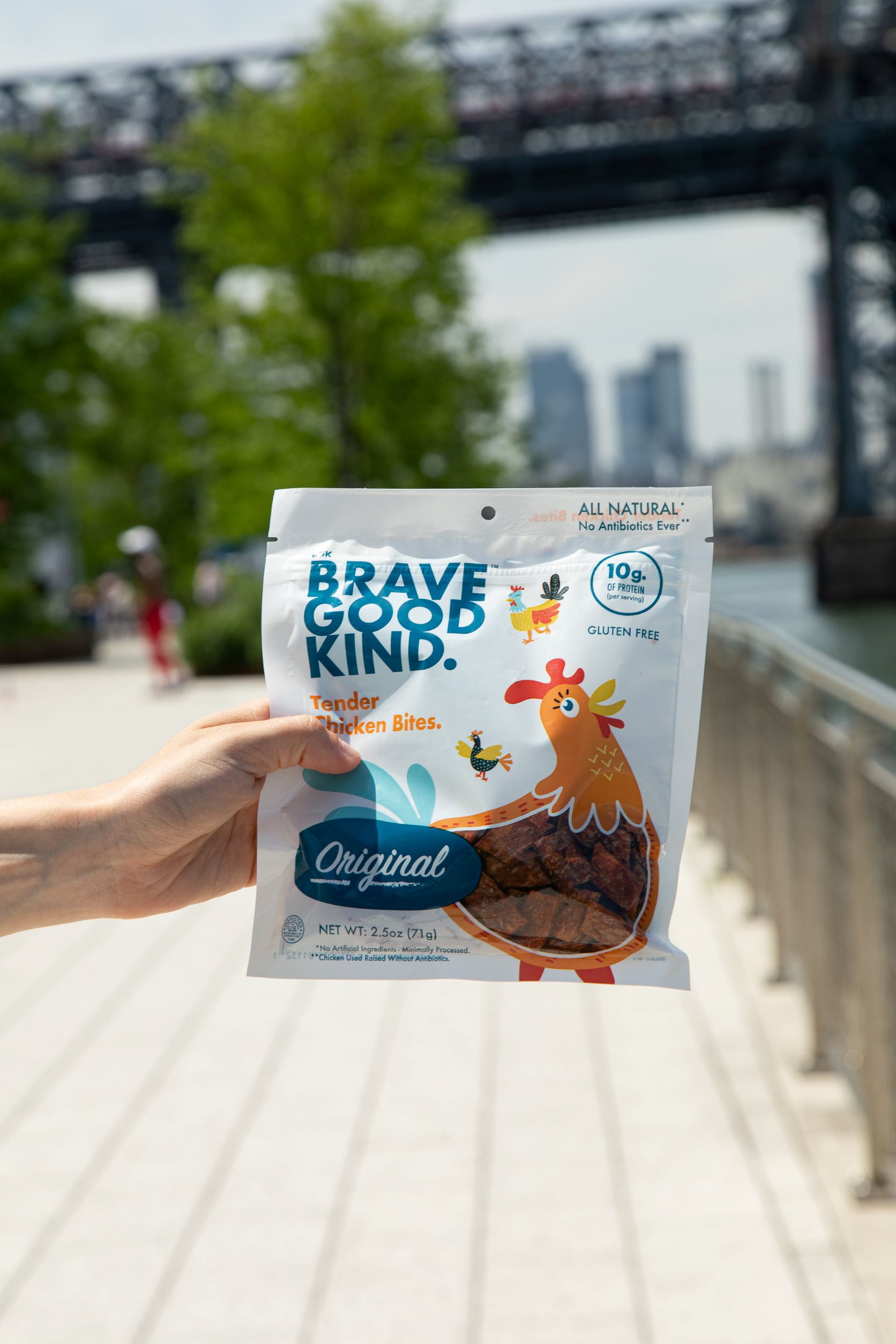 Brave Good Kind Original Flavor Chicken Bites – All Natural, Gluten-Free Protein Meat Snack with No MSG or Nitrates. Seasoned with black pepper and rosemary, BGK Bites are 100% tender, delicious, and packed with 10g of protein. A snack that is flavorful, all-natural, and convenient – each pouch is perfect for the busy professional or the mom who does it all!