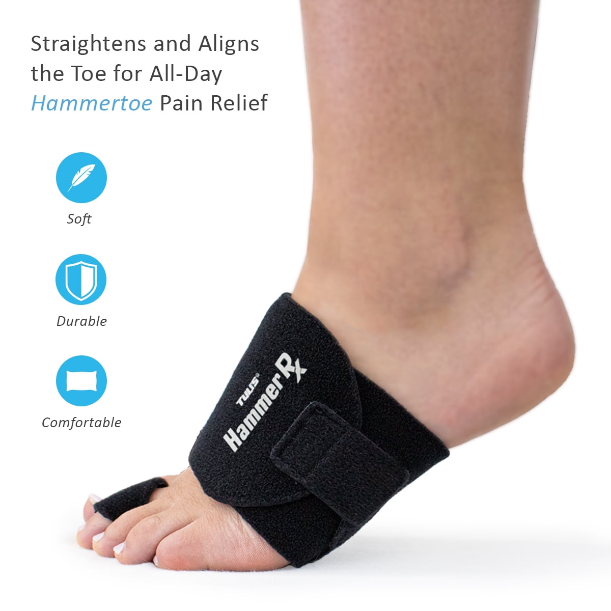 The Tuli’s HammerRx toe straightener comfortably corrects and relieves minor cases of hammertoe or otherwise known as claw toe. Designed by a certified foot and ankle surgeon, the Tuli’s HammerRx corrective support pulls the toe down to keep the toe extensor tendons straight, reducing hammertoe pain and irritation caused by shoes, corns, and calluses. The stretchy material creates the tension needed for a comfortable straightening of the toe. This hammertoe relief product provides a perfect replacement for taping and provides better and more comfortable results. The Tuli’s HammerRX gently straightens and properly aligns the toe for all day comfort. It can be used as a treatment for minor conditions of hammertoe. If surgery is required, it can be used as a post-op treatment to protect the surgery results and aid in healing. The HammerRx is fully adjustable to function for all patients and includes our industry leading Soft-Flex material, which combines maximum flexibility with softness and breathability. The soft-touch hook and loop closures secure the straps in place without causing any irritation. The hook and loop closures keep the strap and toe in place, preventing it from any movement as you walk or perform any daily activity. The soft and flexible material provides you with a natural feel with every step. It’s thin and flexible enough for all-day comfort. HammerRx is easy to apply and use and can be worn with any type of shoe or sandal and can also be worn barefoot. The HammerRx helps you find relief for hammertoe without having to wear uncomfortable gel pads, toes spacers, or going through the trouble of taping. DISCLAIMER: If your hammertoe is not moveable, then this item will not straighten your toe.