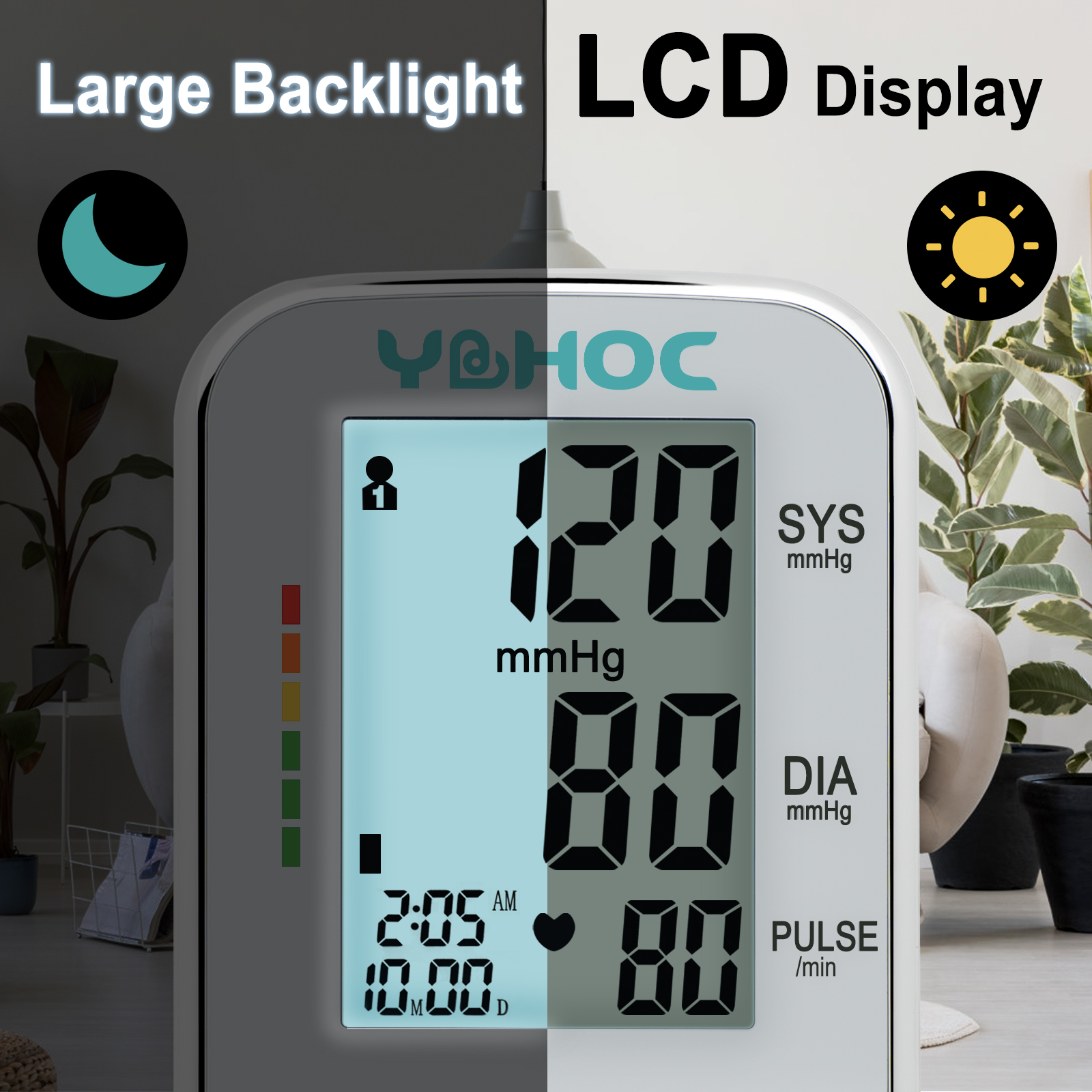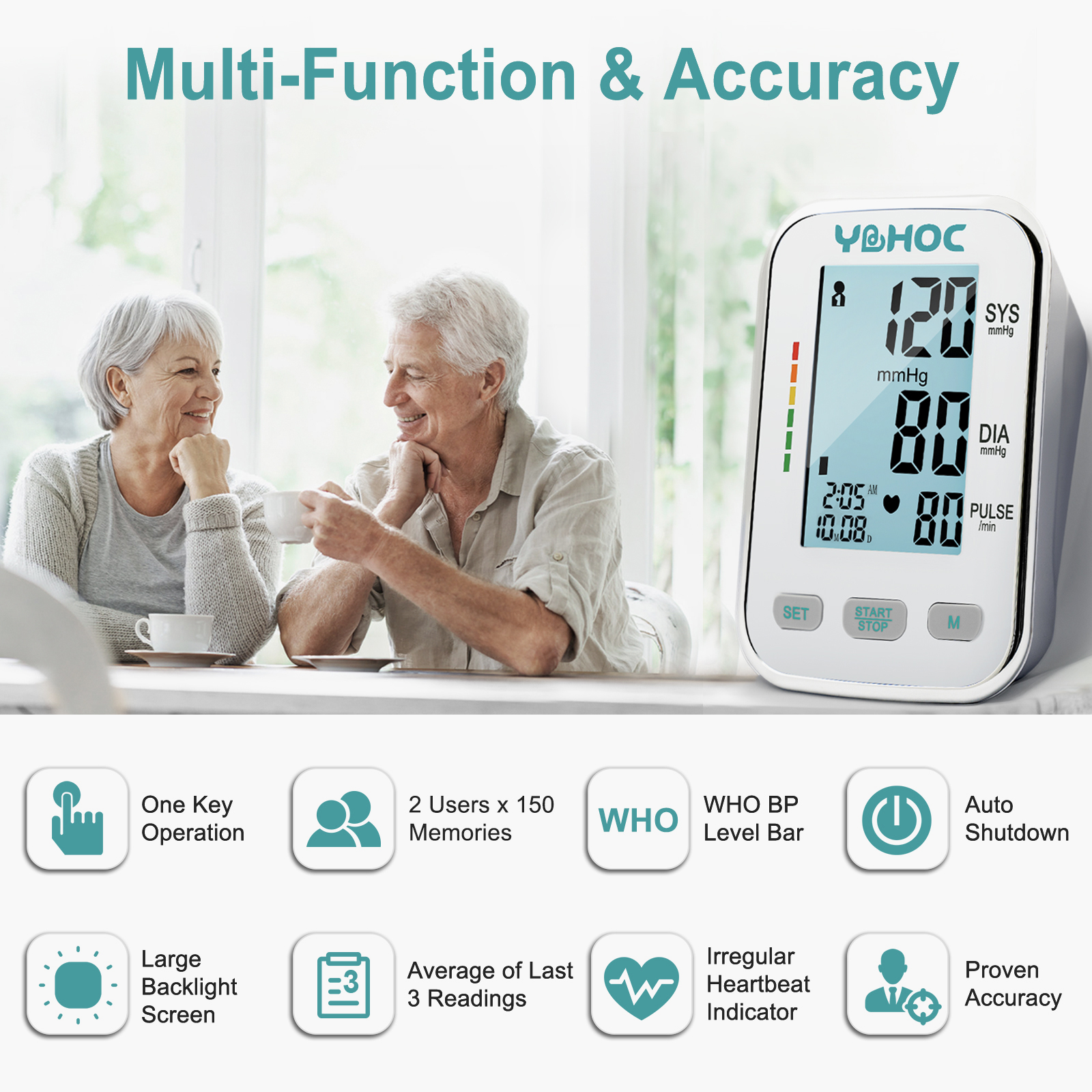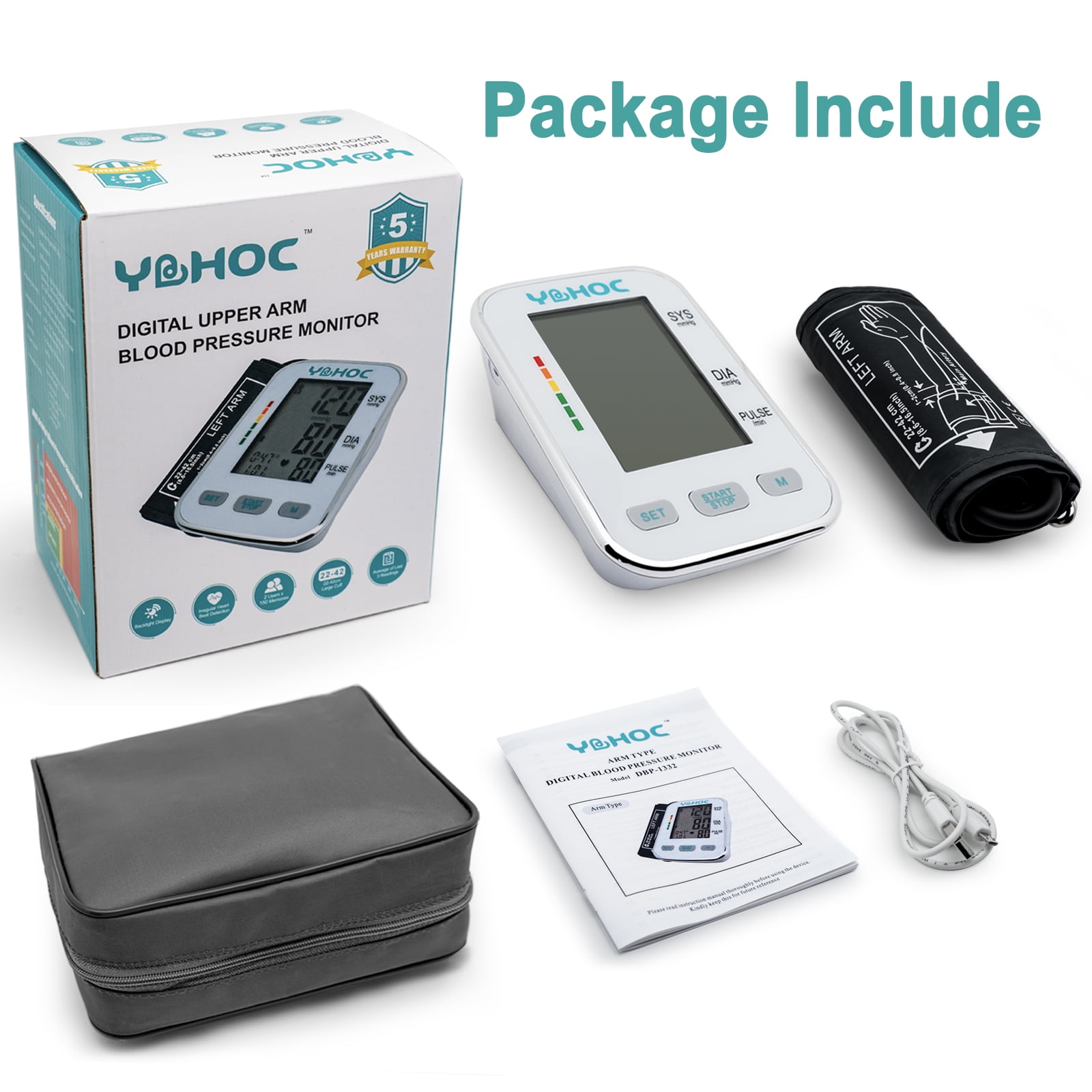 YBHOC Blood Pressure Monitor [User Friendly] A user-friendly interface with large numbers makes it easier to operate the monitor and understand the results. [Backlight Screen] Backlit display for easy reading of results at night. [2 Users x 150 Memories] The advanced memory feature allows two users to track their reading with 150 memories for each user. [Enhanced Accuracy] Automatically average 3 readings for a more precise measurement. [Fully Automatic] Precise, fast, and reliable measurement of blood pressure, pulse, and heartbeat using this professional grade device. [2 Power Options] Use an USB cable or AA batteries(Not include) to power your monitor. [Irregular Heart Beat Detection] The BP monitor will significantly show the irregular heart beat if the heart rate reading is out of its usual rhythm and skipping or adding a beat. Package Included: 1 x Blood Pressure Monitor 1 x Cuff 8.6”-16.5”/22-42cm 1 x USB Cable 1 x Zipper Bag 1 x Instruction Manual