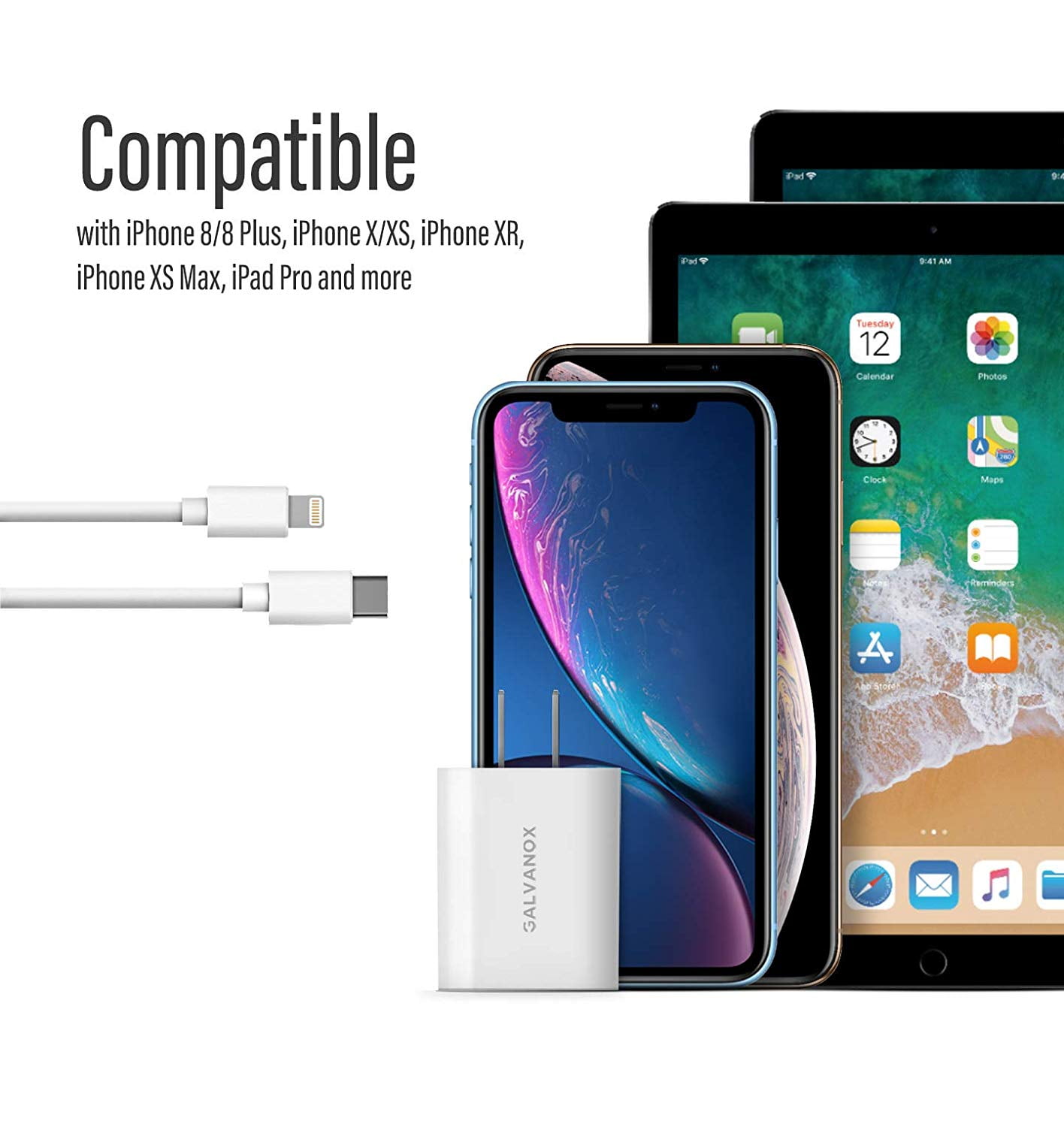 Galvanox Fast iPhone Charger – MFi Apple Certified USB C to Lightning Cable with PD Wall Plug (18W) Quick Charging Power Delivery Adapter for iPhone 8 Plus/Xs Max/Xr/11/12/13 – White