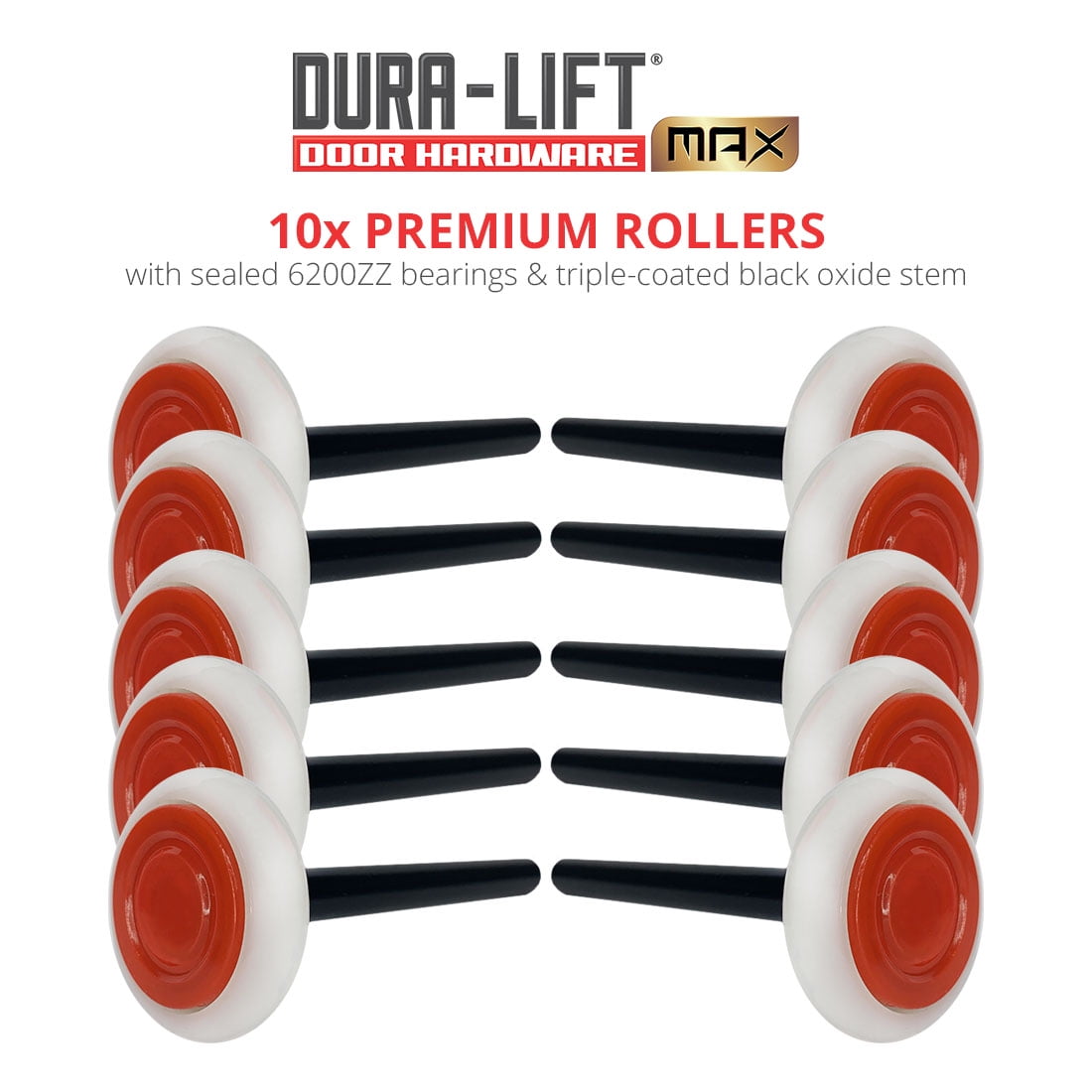 DURA-LIFT Ultra-Life MAX Plus 2′ Sealed 6200ZZ Nylon Garage Door Roller with 4′ Corrosion Resistant Stem (10 Pack)
