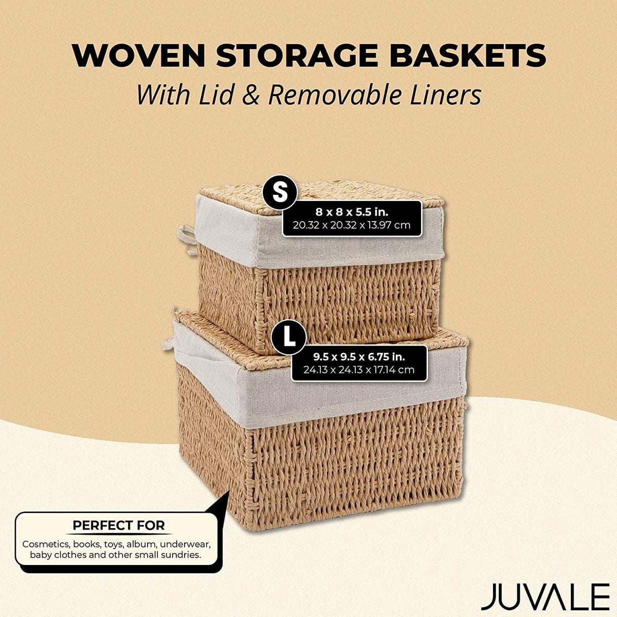 2 Pack Brown Large Nesting Wicker Baskets for Storage Organizing Shelves with Lid & Liner, Woven Lined Bins Home Laundry Organizer, 2 Sizes