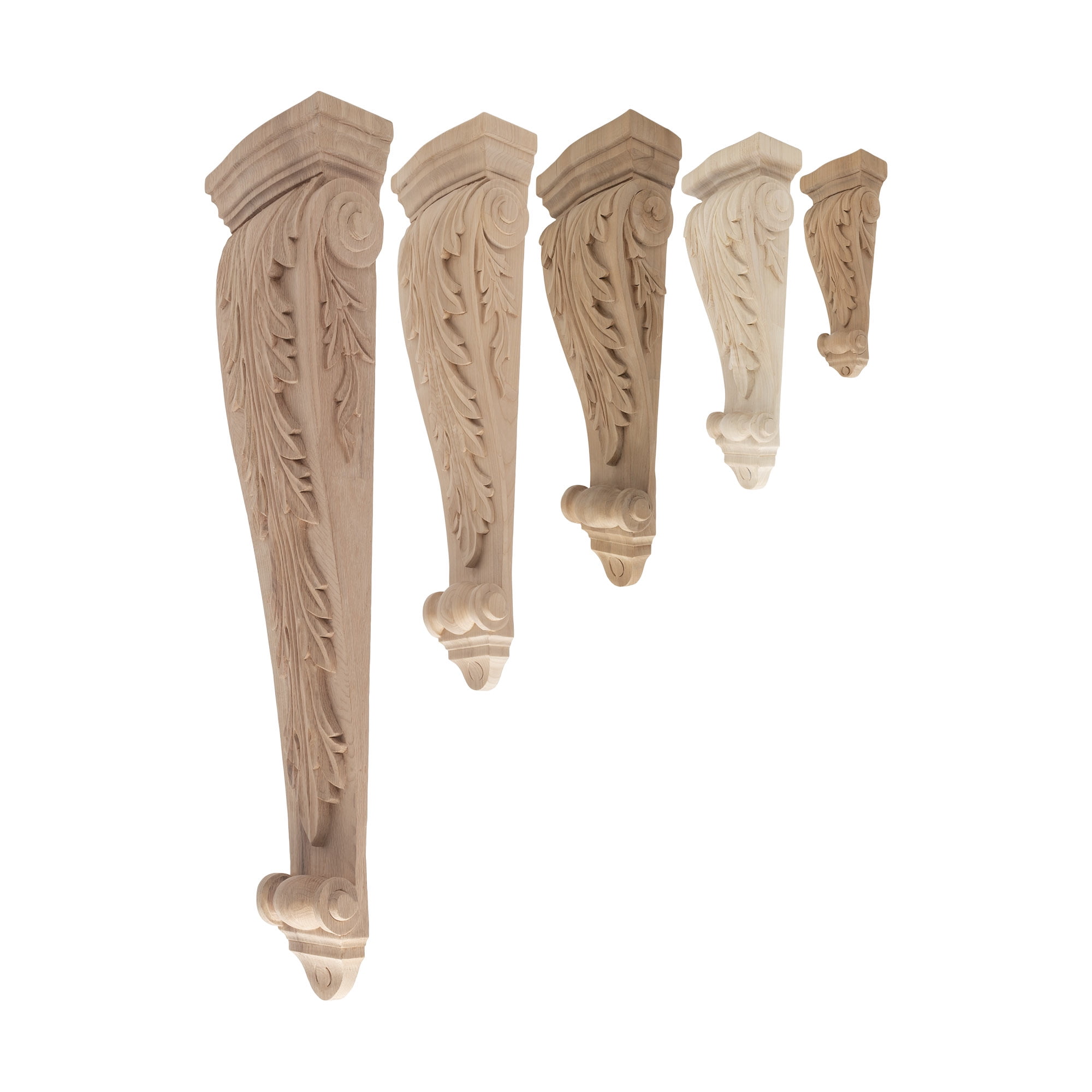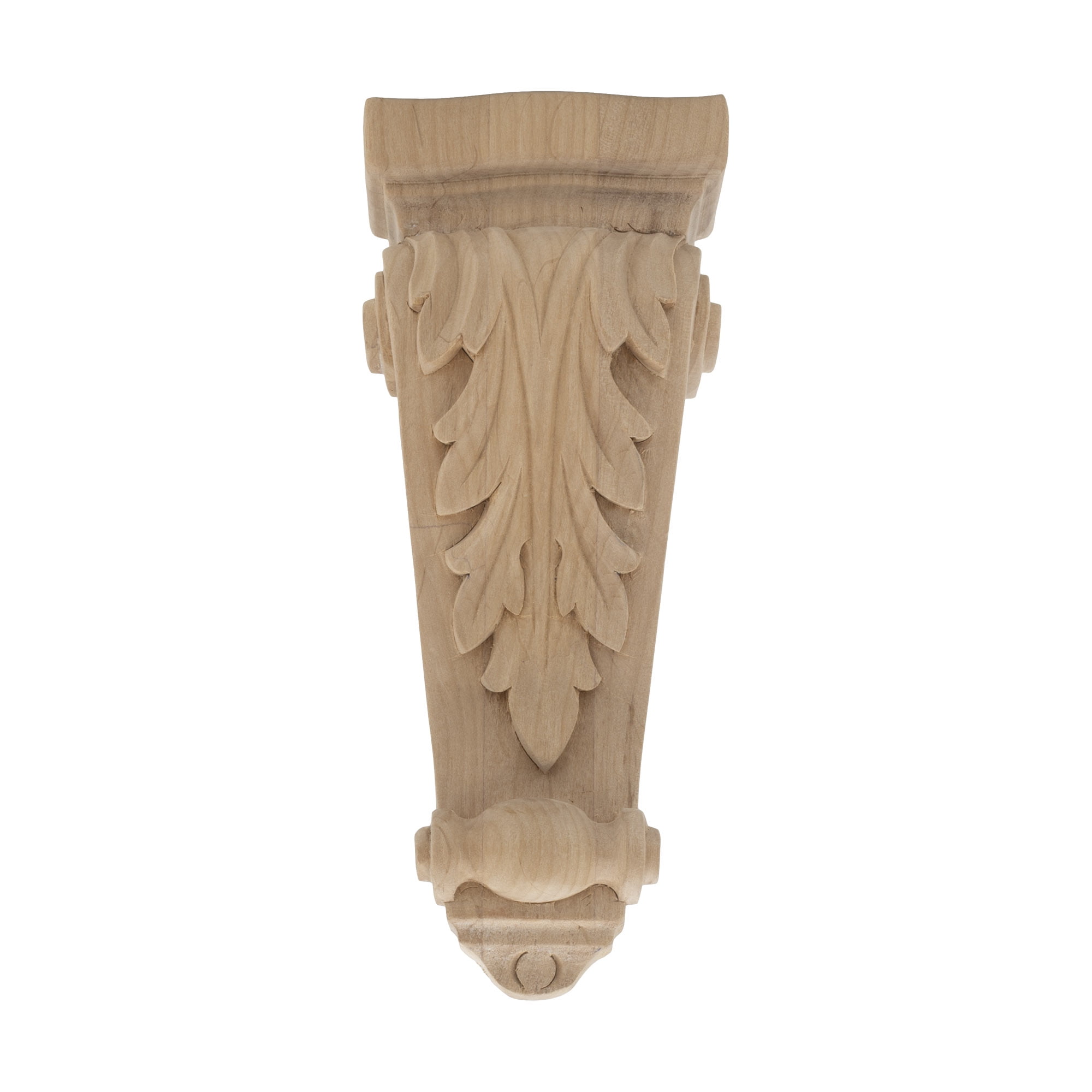 Each Corbel is meticulously hand carved by skilled and experienced artisans who pay delicate attention to intricate detail, beauty, and ornamentation. The design motifs are carefully hand carved in deep relief to achieve the highest standards of fine quality, embellishment, and authenticity. Hand carved from furniture grade North American Solid Hardwoods. Used for wooden furniture cabinetry projects such as kitchens islands, decorative ornamentation under countertops overhangs, under oven range hoods above the stove. The use of Hand Carved Corbels has become an eye-catching to any kitchen. They are also widely used as a decorative ornament under shelving and as a stand-alone wall mounting to display any artistic display.7-1/8 in. x 2-3/4 in. x 1-3/8 in. Unfinished X-Small Hand Carved North American Solid Alder Acanthus Leaf Corbel