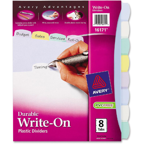Avery Big Tab Write & Erase Durable Plastic Dividers, 8 1/2" x 11", Multicolor Brights, 8-Tab – These Avery Big Tab Write & Erase Durable Plastic Dividers let you write, erase and reuse your 3 ring binder dividers, ready for easy changes at any time. Easily customize your dividers by writing directly on the stylishly shaped tabs with a ballpoint pen or pencil, and erase as needed. You can also take quick notes on the 8.5" x 11" plastic divider body and easily erase later.