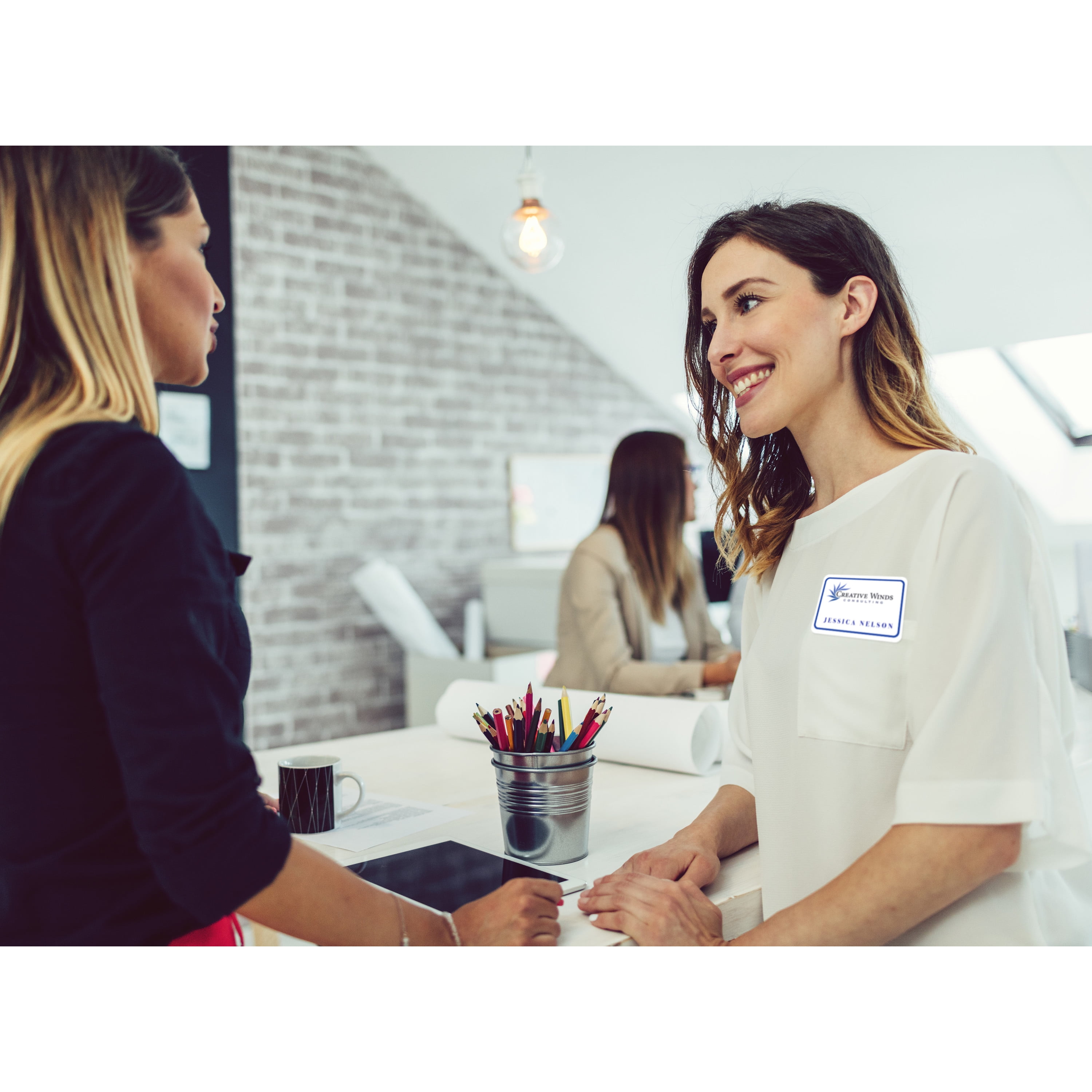 Create personalized name tags that last with flexible Avery Name Badges. These superior 2-1/3” x 3-3/8” identification stickers move with your clothing, making them the perfect name tag labels that will stick securely and not fall off. Featuring an innovative Peel-Away design, these adhesive name tags are easy to separate from the 8.5” x 11” printed label sheet, while the individual label backing remains intact until ready to use, saving you tons of time when preparing for events. Removable adhesive adheres firmly to most fabrics without curling, lifting or falling off, but is not recommended for use on delicate materials like corduroy, plastic, leather, silk, suede, velvet or vinyl. These durable adhesive name labels are fantastic for corporate events, reunions, parties and showers. The printable rectangle labels also make great organization labels, gift tags, arts and craft stickers and more. They’re perfect for teachers to use as student name tags for classrooms, assigning cubbies or desks, labeling supplies and more. Add that personal touch to your personalized name badges by hand or customize them easily using the free templates and designs found on the Avery website, and print them easily on your laser or inkjet printer. Item comes with 400 blank name tags with blue border.