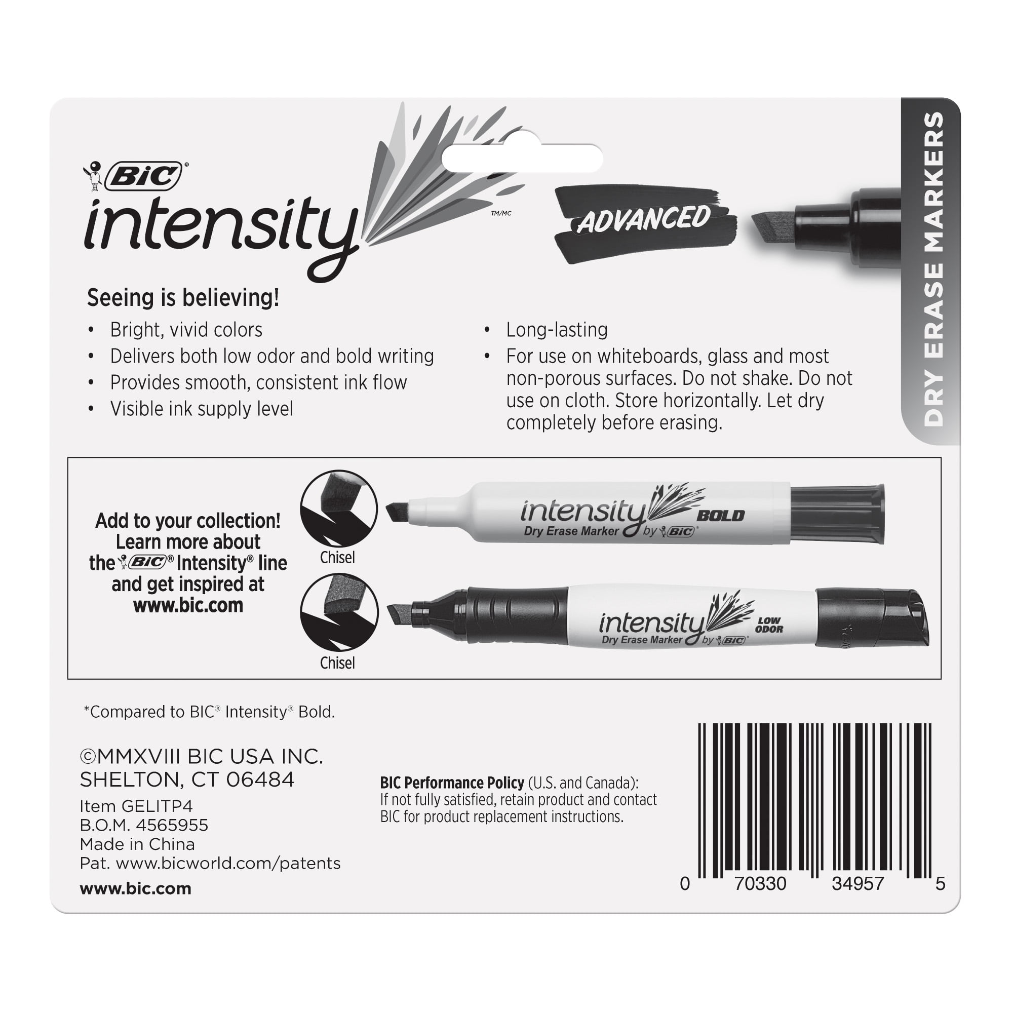 Featuring low-odor, bold ink, BIC Intensity Advanced Dry Erase Markers are ideal for school, work, and home projects. These non-toxic markers offer smooth, consistent ink flow on dry erase boards, glass, and most non-porous surfaces. The versatile chisel tips are great for both broad and fine lines, and marks erase easily. These ACMI-approved markers feature a long-lasting supply of liquid ink that is visible through the barrel, so you can see how much is left. This pack contains 4 assorted dry erase markers.