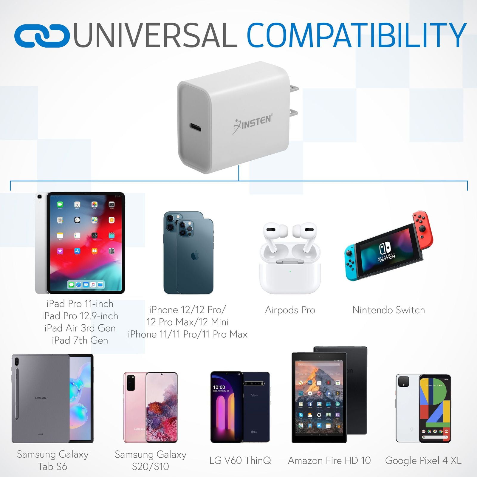 The Insten portable iPhone quick charger is compatible with lighting cable cord and also charges your Samsung Galaxy S21/20/Note 4 5 6 7 8 9, kindle tablets, Huawei, Vivo and Moto phones and power bank. This type C charging block charges your Apple and Android phone effortlessly and works well with wireless/fast and lighting chargers. These cell phone chargers & power adapters and charging station is one of the best iPhone accessories for your smartphone. These are great accessories and supplies for your home office, desk and gaming setup. Product names are trademarks of listed manufacturers or other owners, and are not trademarks of eForCity Corp. The manufacturer does not necessarily endorse the use of these products.