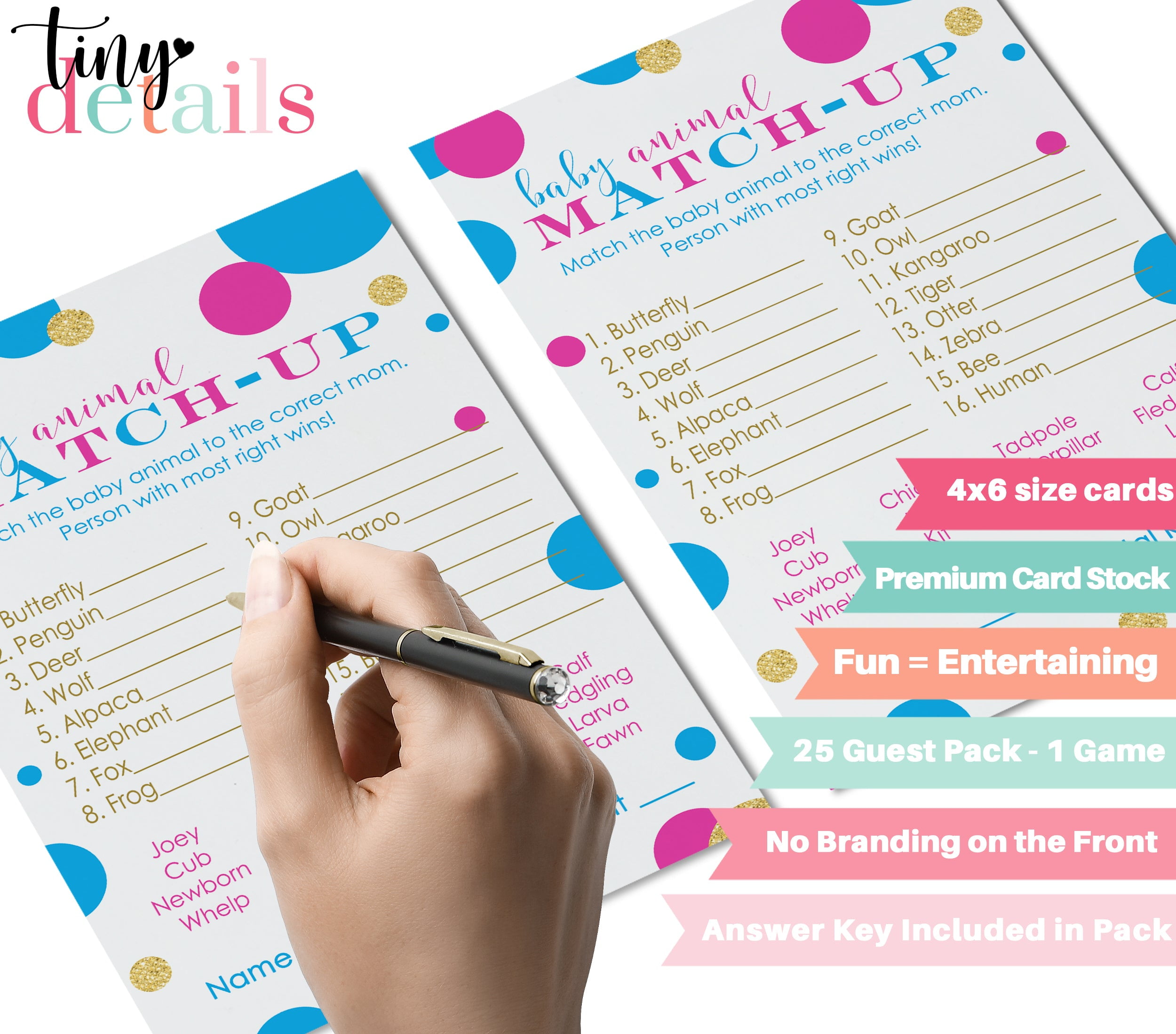 Gender Reveal Animal Match Game 25 Pack Baby Shower Guessing Activity Cards - Pink or Blue Boy Girl Theme - Printed Set 4X6 Size - Paper Clever Party