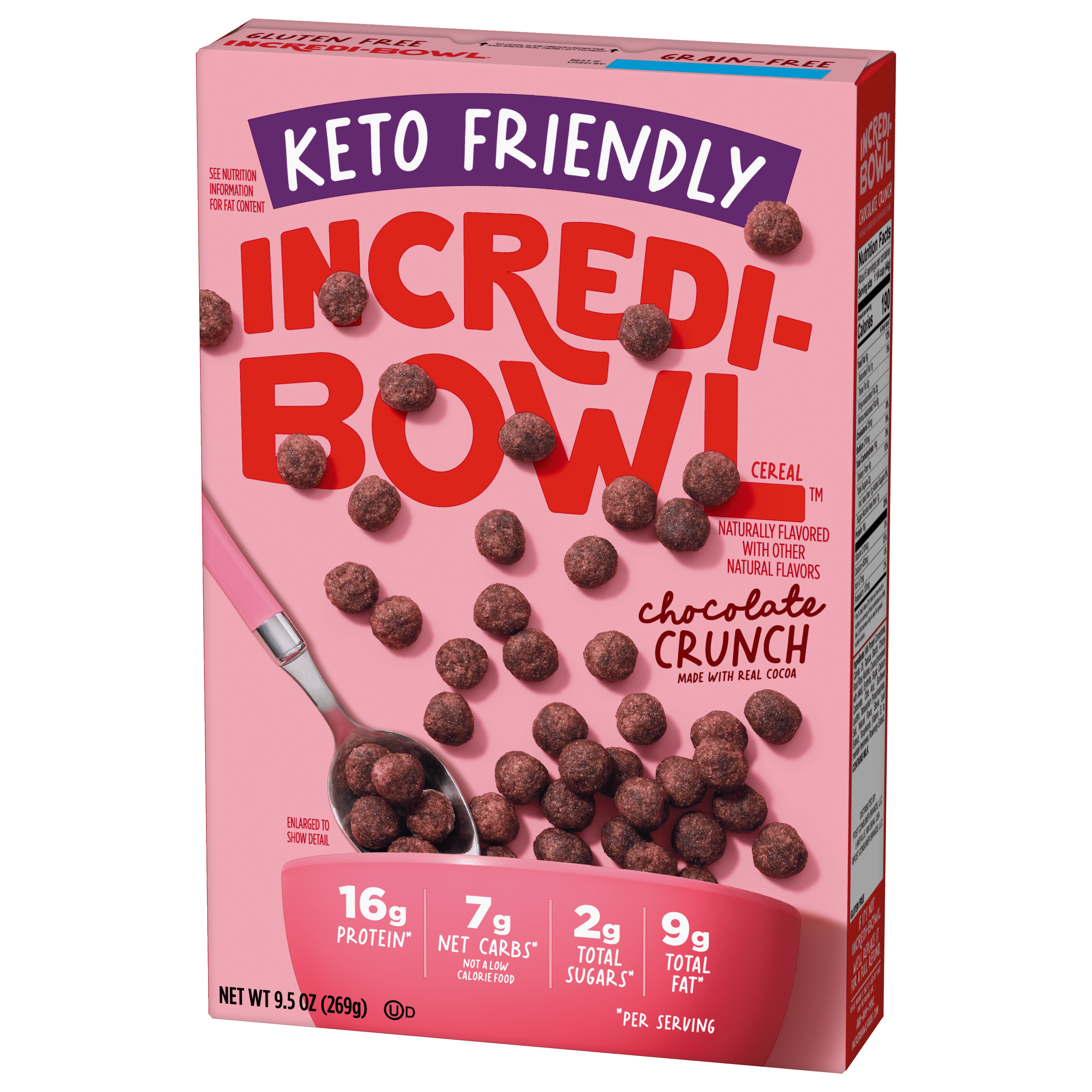 - Incredi-Bowl™ Chocolate Crunch is a deliciously crunchy gluten free cereal that is made with real cocoa and is an excellent source of protein. This grain free cereal is keto friendly, with7g net carbs, and is an excellent source of calcium. Net Carbs* = Grams of Total Carbohydrate – grams of Dietary Fiber – grams of Allulose – grams of sugar alcohols (values vary by flavor).