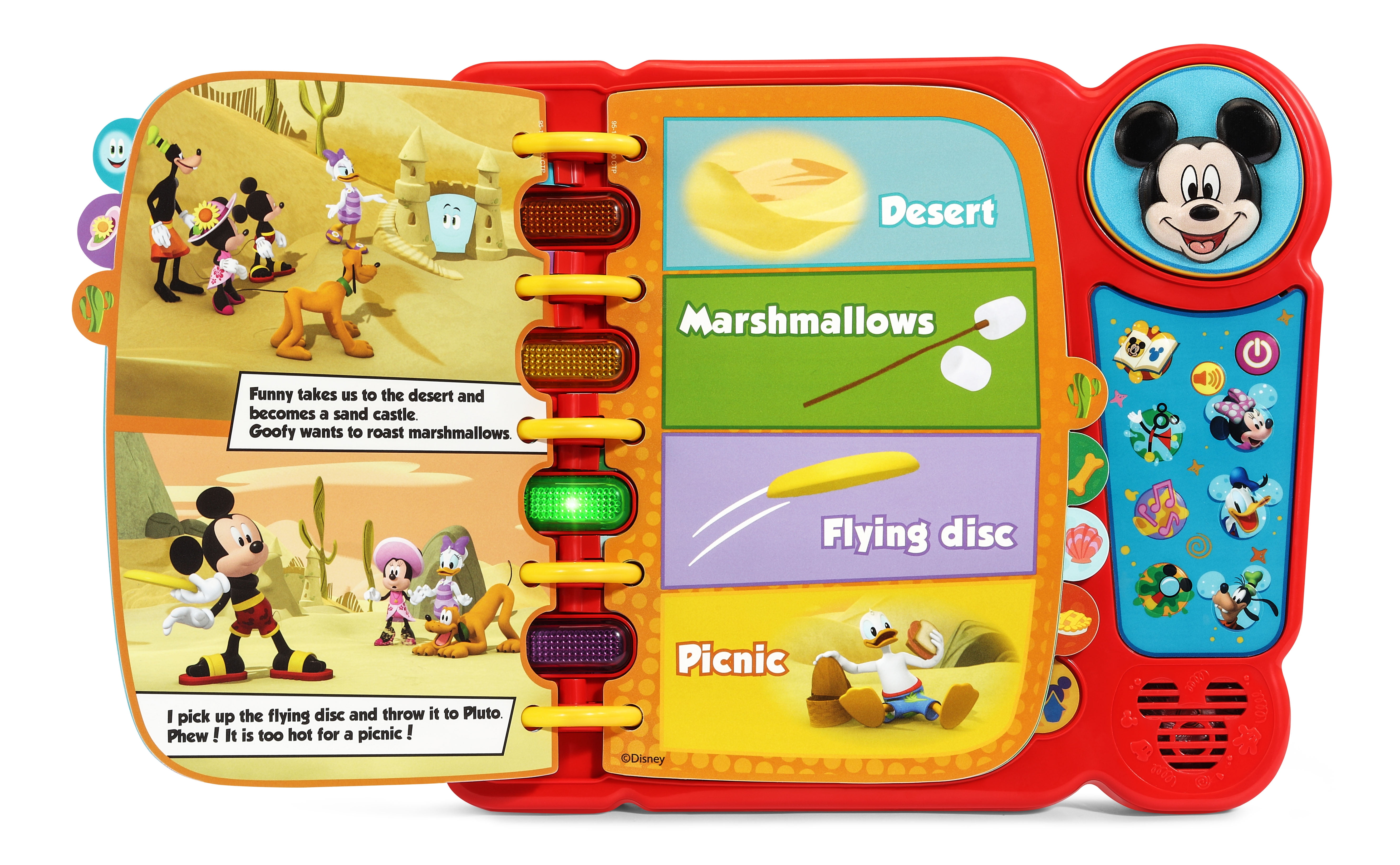 Its story time! Go on imaginative adventures with the Disney Mickey Mouse Funhouse Explore & Learn Book. Read along and travel with Funny the Funhouse as he takes Mickey Mouse and friends to the desert, the ocean and to meet a dragon. While exploring each exciting location, discover the names of different objects to build vocabulary. Lets play a game to find the things in the story! Listen to Mickey Mouse list objects from your adventures and find them in the correct order. Play music inspired by the show and get creative by pressing the light-up buttons to add sounds to the melodies. Hear Mickey Mouses real voice and listen to him talk about his friends Minnie Mouse, Donald Duck and Goofy. Take the stories on the go with the handle. Intended for ages 2-5 years. Requires 3 AA batteries. Batteries included for demo purposes only. New batteries recommended for regular use.