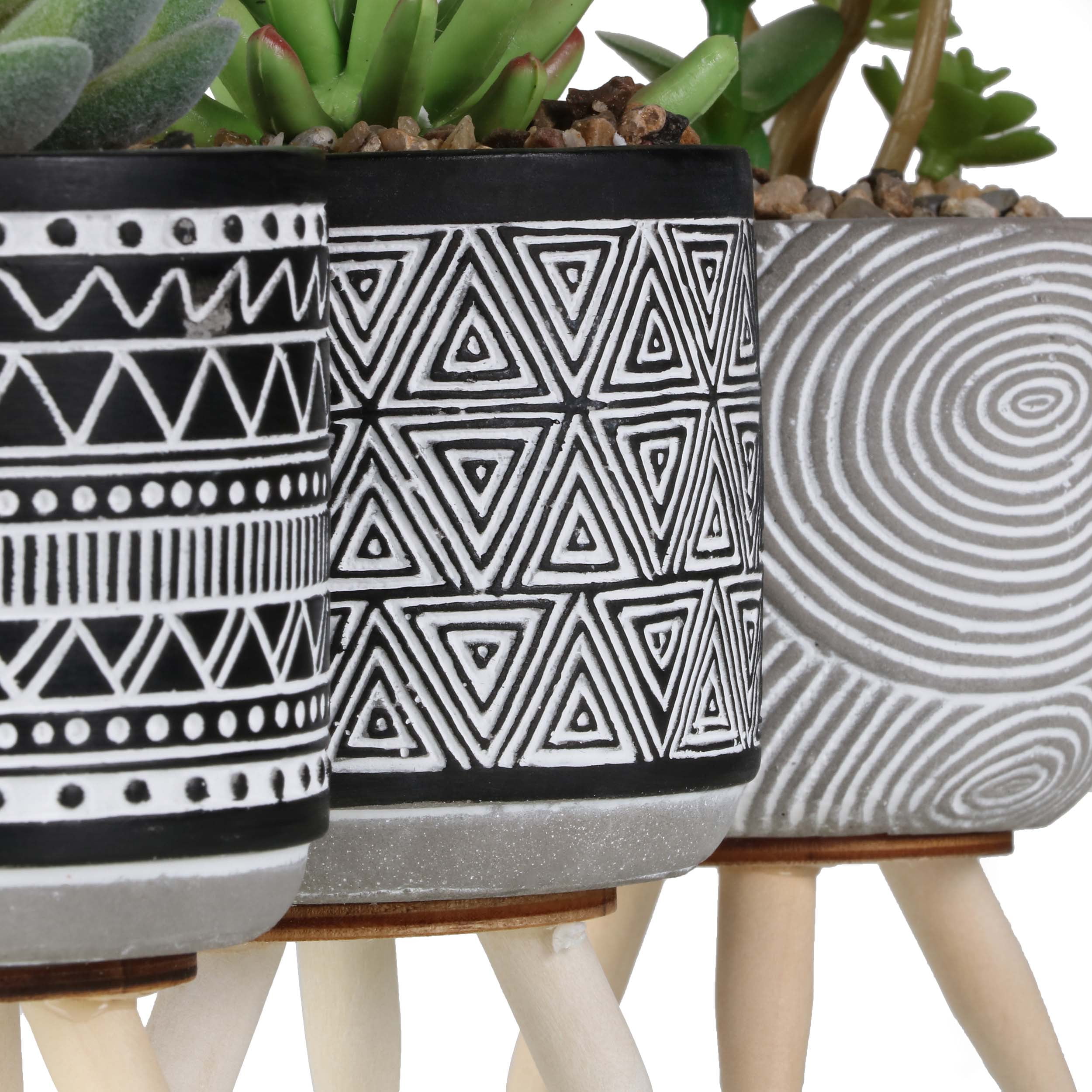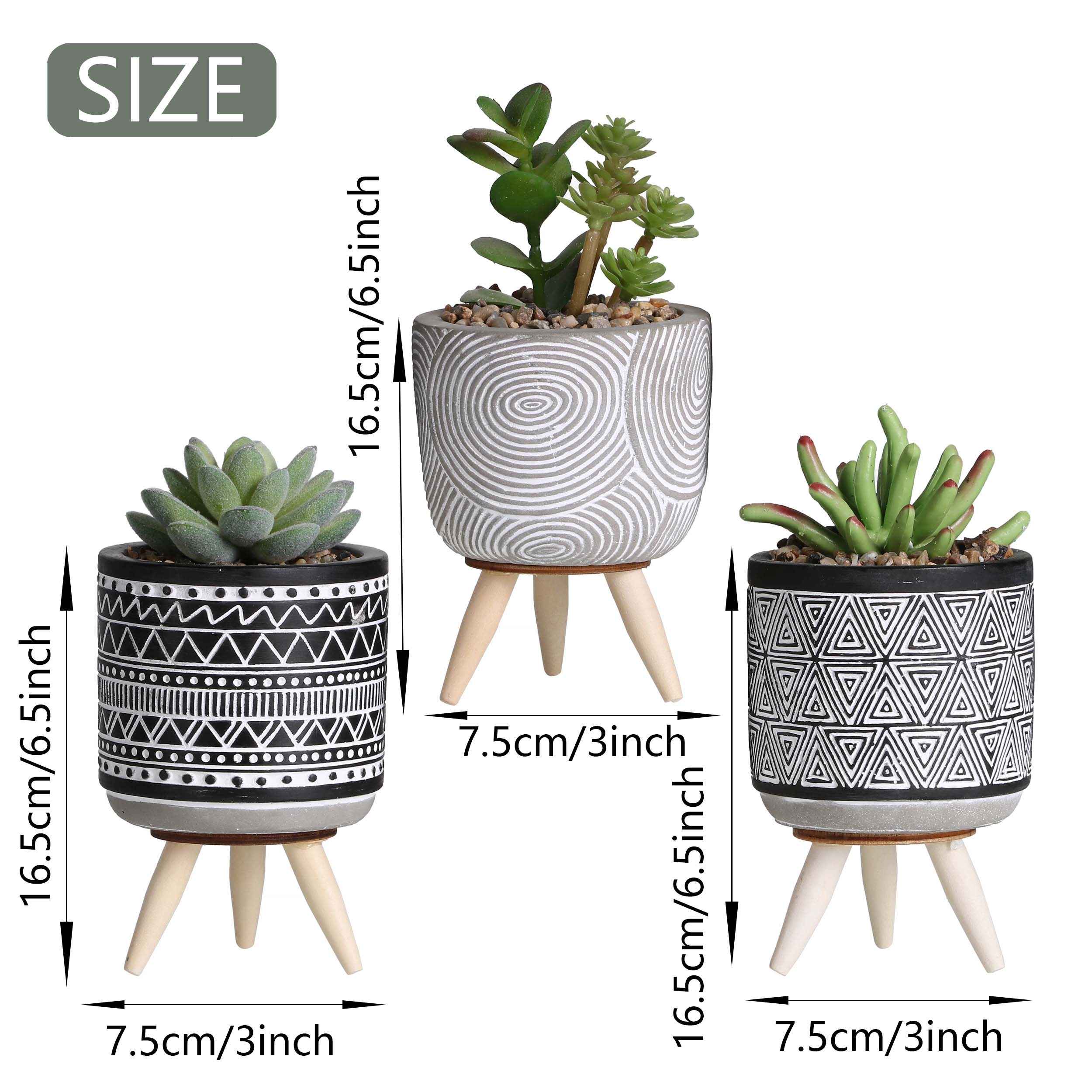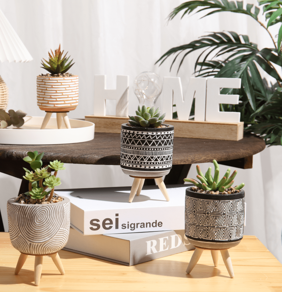 - 【Exquisite Craftsmanship】Hand-made ceramic pots and wooden tripods are perfectly combined. The geometric patterns were engraved on the planter, which makes it more textured. The pebble soil and assorted faux succulent are firmly glued into the pots to keep everything in place.
