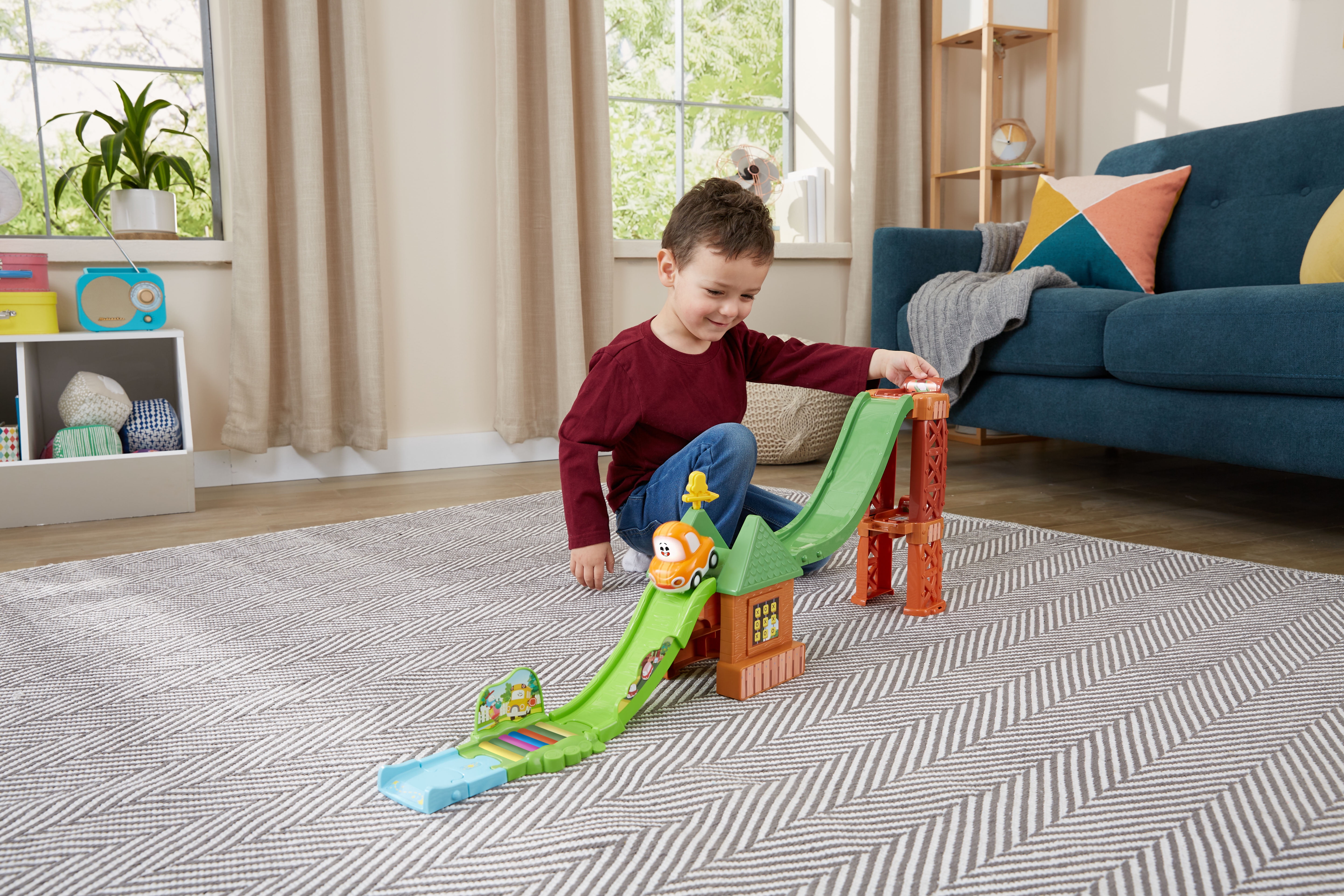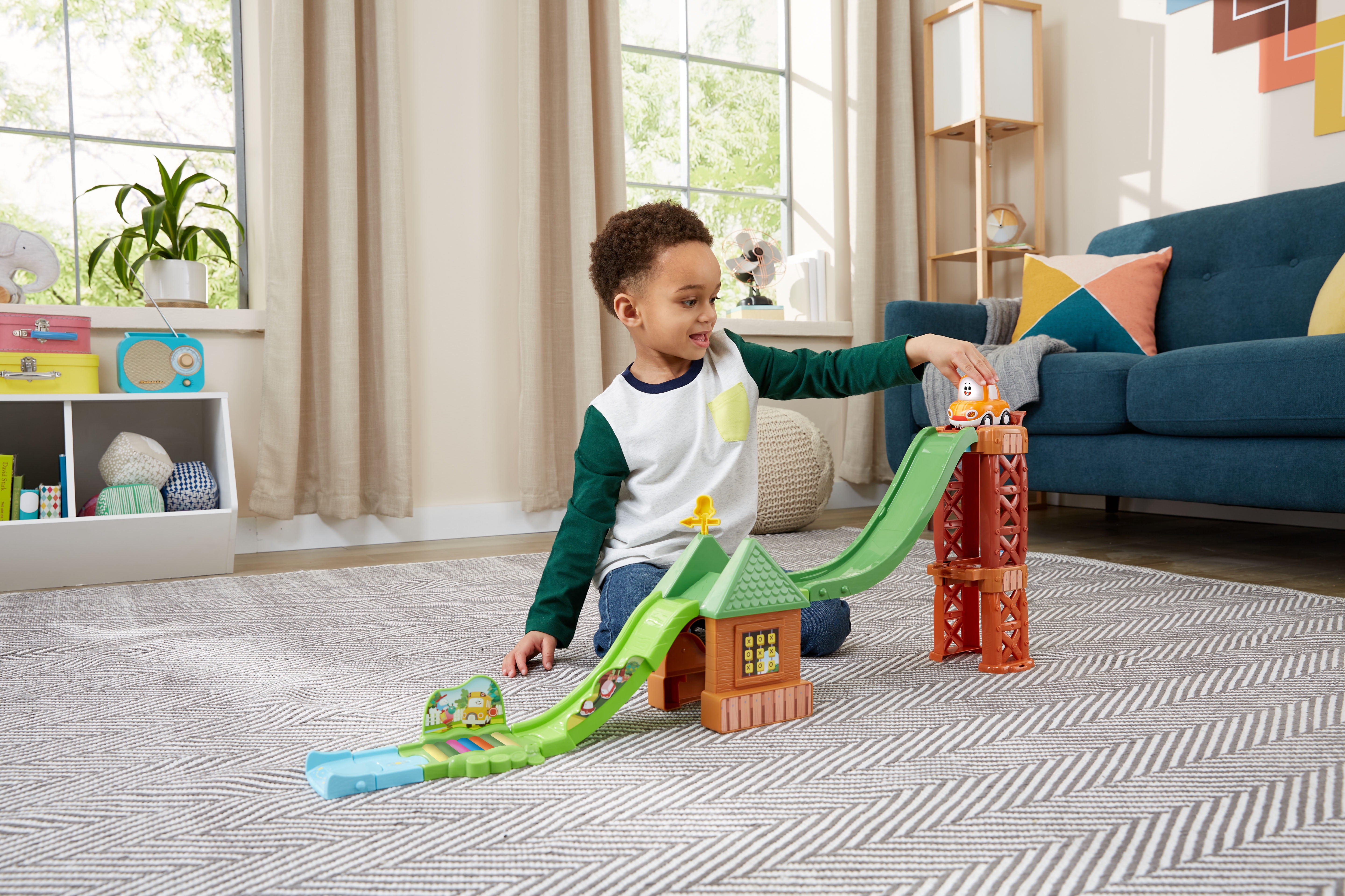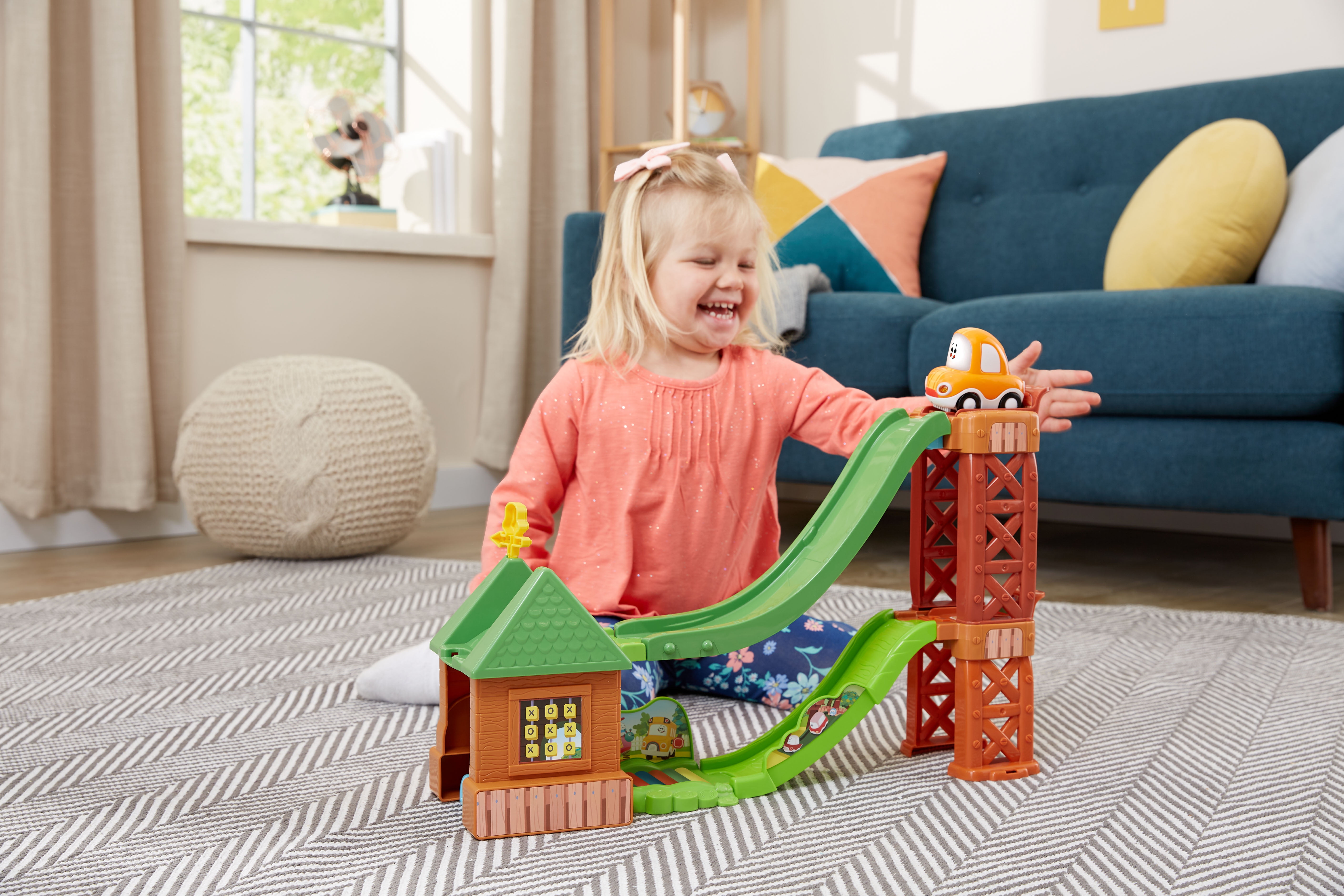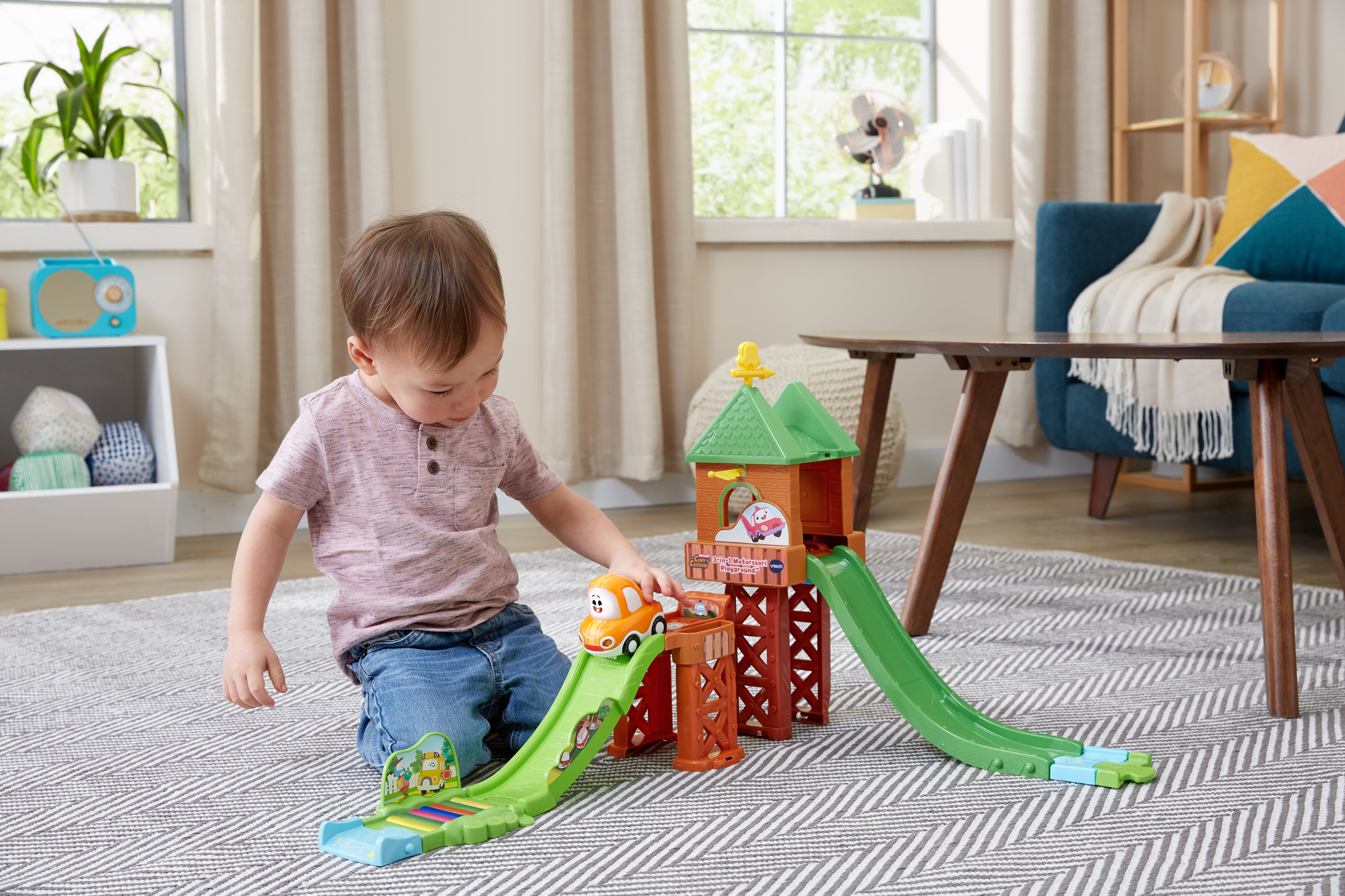 Race down the slides with the Go! Go! Cory Carson 3-in-1 Motorssori Playground playset just like in the original animated series, Go! Go! Cory Carson. Build motor skills by rearranging the tracks to create three exciting playgrounds complete with a launcher. Stack the slides on top of each other for stunt slides, place them end to end for a super slide or side by side for dual slides so Cory can race alongside his friends. Lift the launcher and watch Cory zoom down the tracks! Press Corys light-up windshield button to hear Cory talk and listen to sound effects and songs from the show. Place SmartPoint characters (sold separately) on the SmartPoint location to hear them respond with exciting sounds and phrases. Intended for ages 2+ years. Requires 2 AAA batteries. Batteries included for demo purposes only. New batteries recommended for regular use.