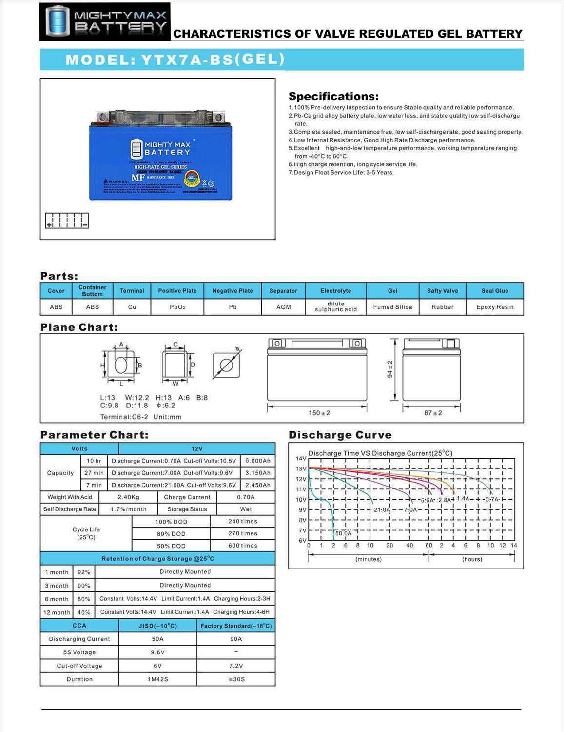 - YTX7A-BS GEL is a 12V 6AH 105 Cold Cranking Amps (CCA) GEL (Maintenance Free) Battery