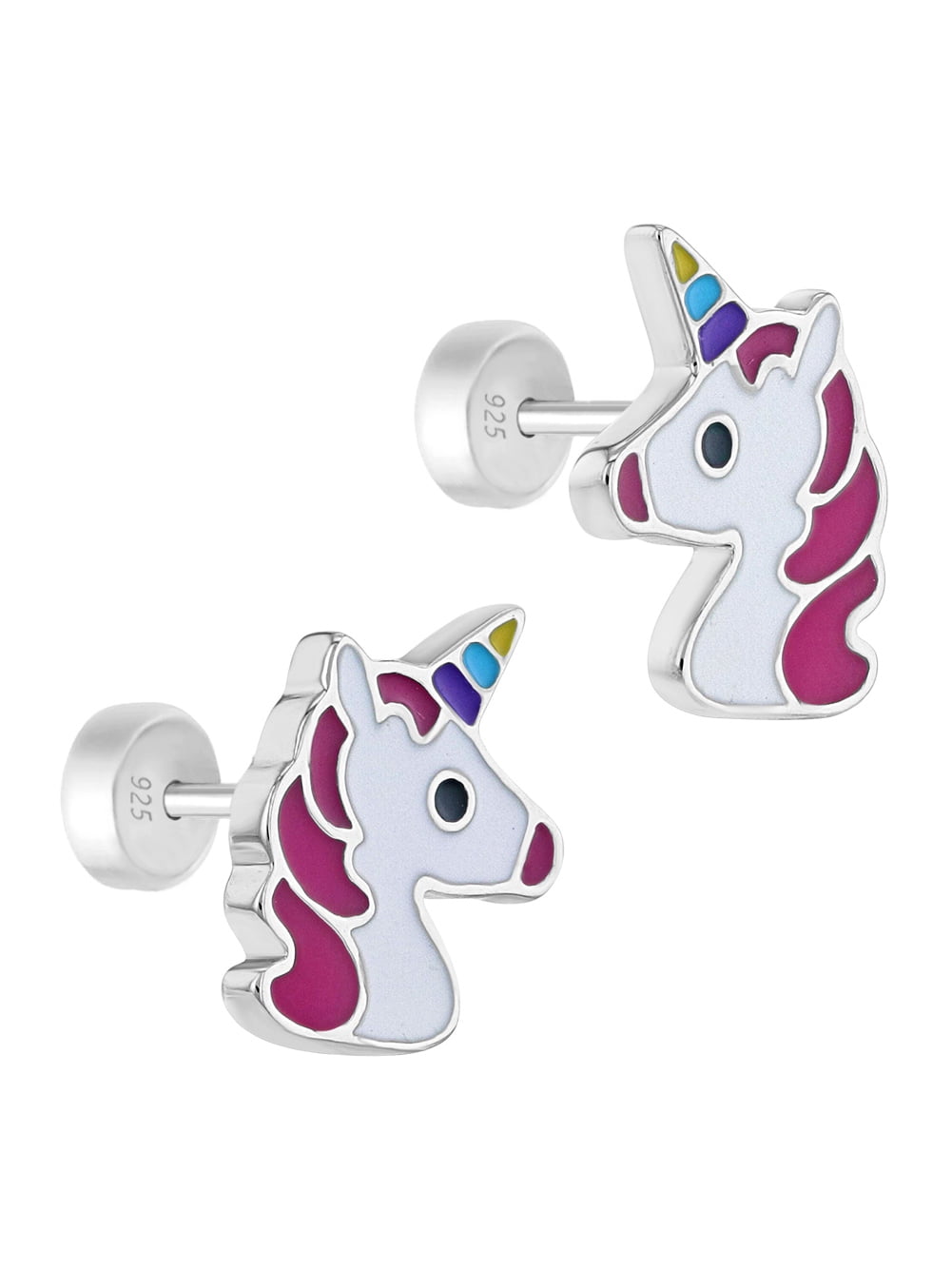 Rainbow Unicorn Kids / Girls Earrings Safety Push Back – Sterling Silver
