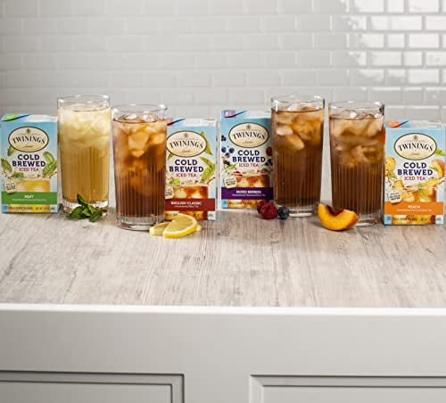 Twinings Cold Brewed Iced Tea Bag Sampler 40 Ct Includes: Mint, Mixed Berries, English Classic, and Peach – with By The Cup Sugar Packets