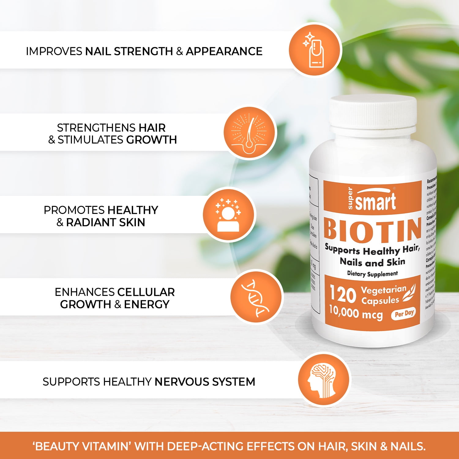 Supersmart – Biotin 10000 mcg per Day – Hair, Skin & Nails Vitamins Pills – B Complex Supplement | Non-GMO & Gluten Free – 120 Vegetarian Capsules