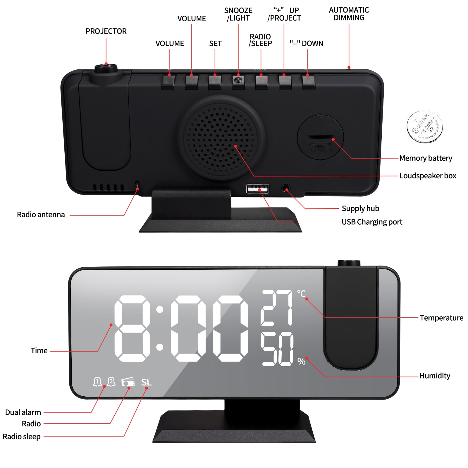 2BK Digital Projection Alarm Clock Wall Clock for Bedroom with Projection on Ceiling