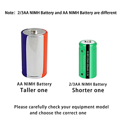 2/3AA 1.2V NIMH Rechargeable Battery with Button-Top 650mahBattery be over cyclesStandard Charge Current :65(mA) 15h;Rapid Charge current 1.2hBattery size:0.57*1.14 inch (29.5*14.2mm) Works outdoor solar lights,camera,controlller,palyer,toys,clock,Electric Razor, Toothbrush etc2/3AA Size NIMH Rechargeable Battery 1.2V 650mah Button-Top Battery 6Pcs