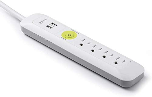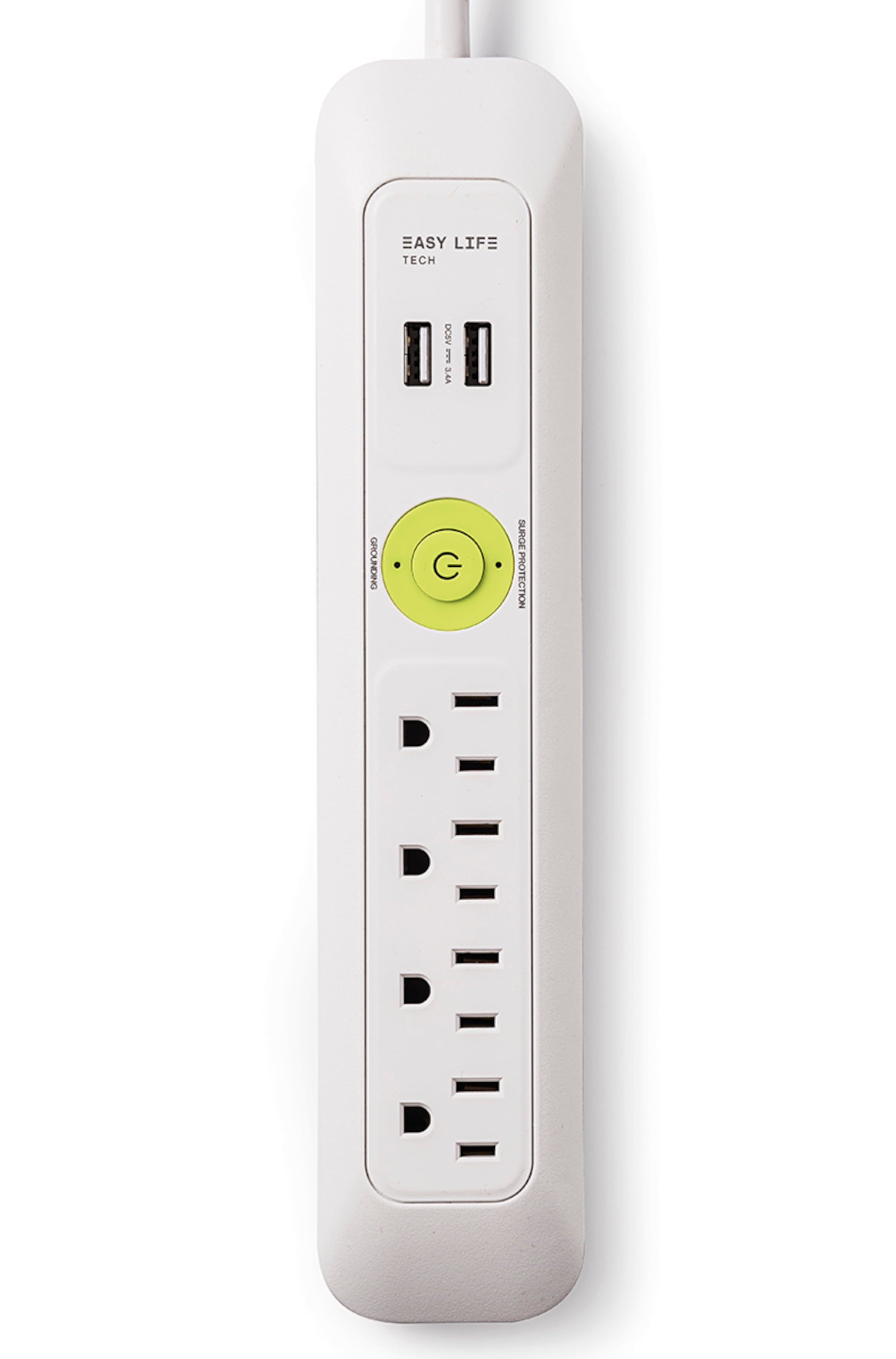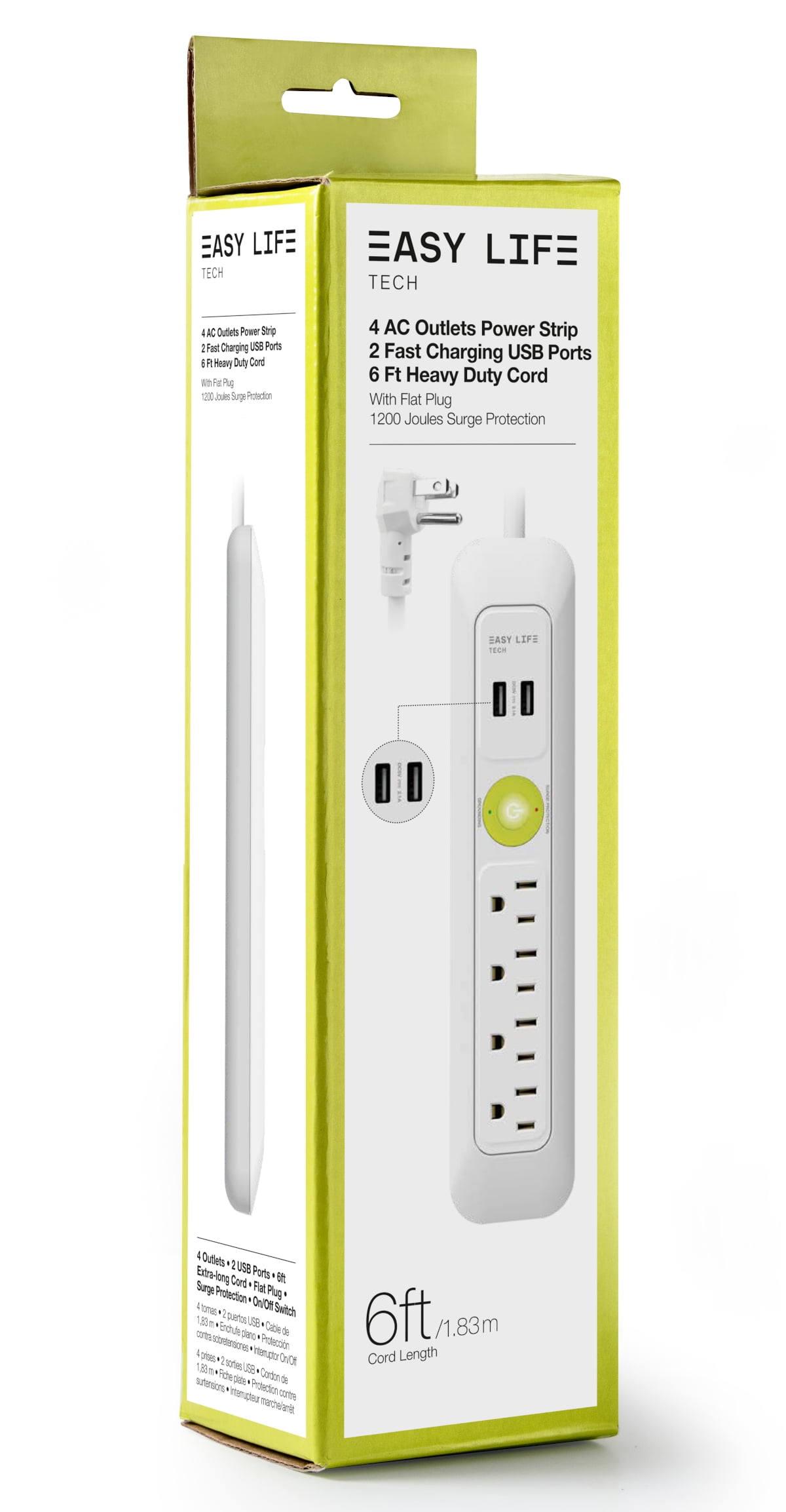 Easylife Tech Power Strip with 4 outlets, 2 USB, and 1200 joules of surge protection to ensure connection safety. Reach any outlet with the 6 ft heavy duty cord and built in flat plug. Designed for home and office use. On/Off switch displays a light to show when your electronics are receiving power. 2 keyhole slots for wall mounting. White model, unit is also available in black. Lightweight build makes it easy to travel with.