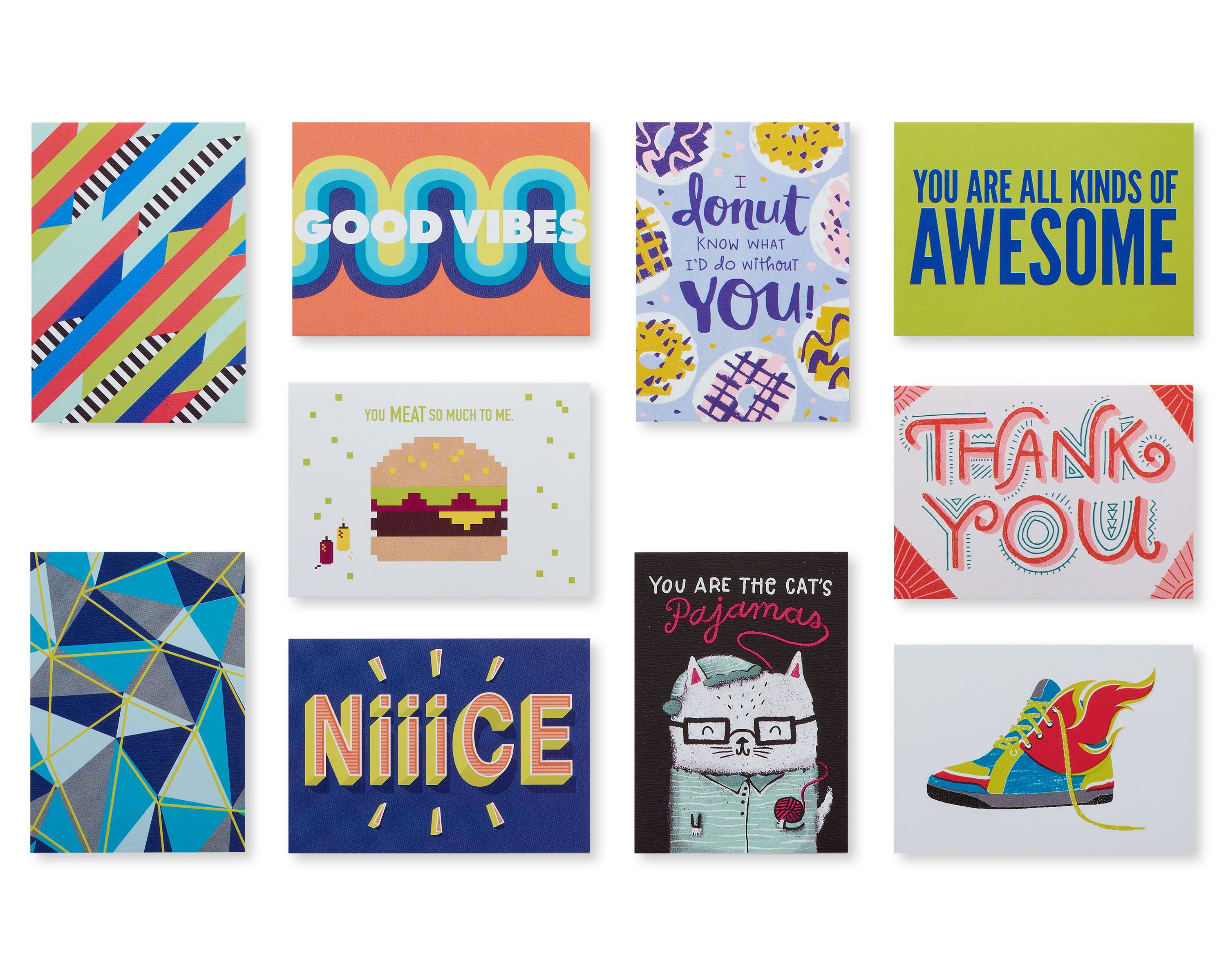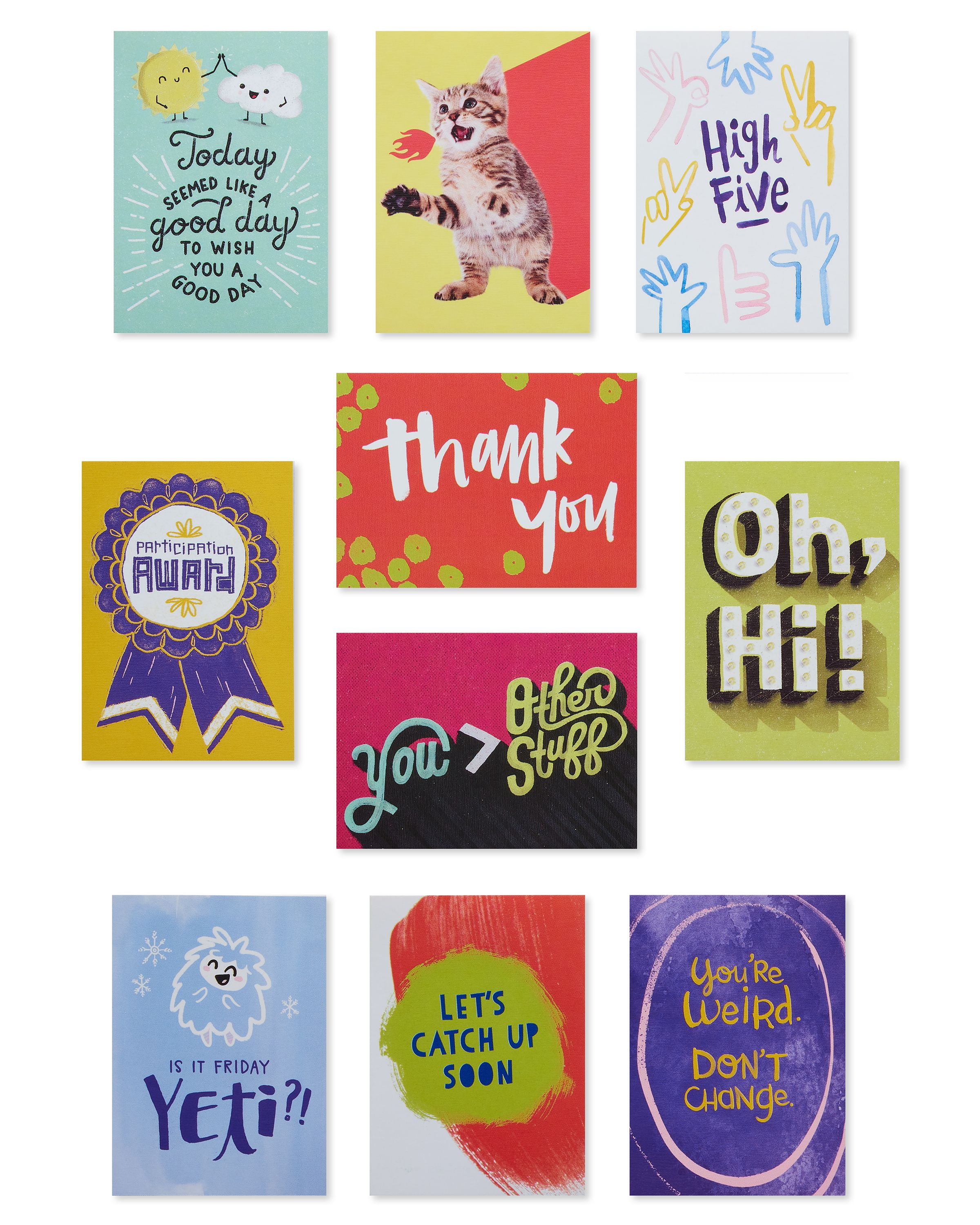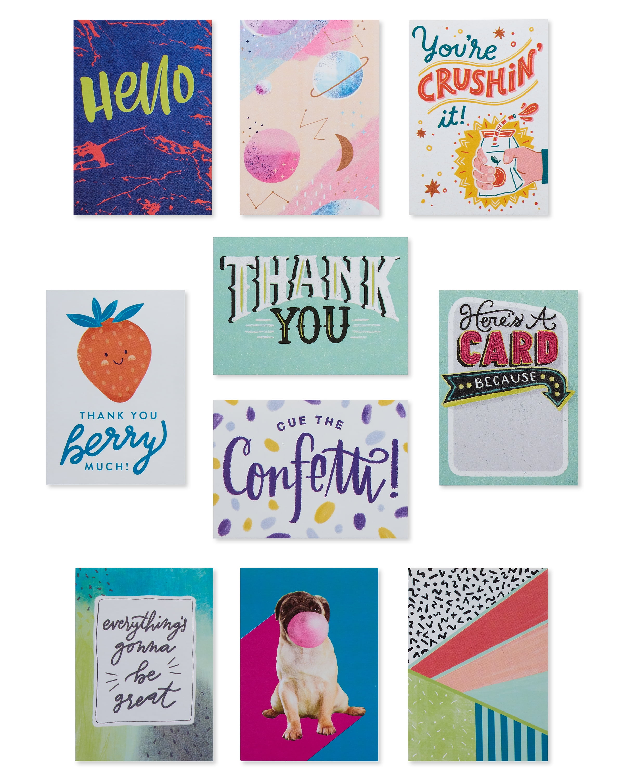 Share little notes of kindness! The Happy Vibes collection includes a total of 40 mini note cards with super bright, colorful, cute, trendy and LOL looks that will add instant smiles to anyone’s day! Share more and more often: mini encouragement cards offer phrases like, ‘Hello,’ ‘Thank You,’ ‘Let’s catch up soon’ and ‘High Five,’ as well as fill-in-the-blanks and patterns only. Share them everywhere: place one in a friend’s locker or desk, a neighbor’s mailbox, your child’s packed lunch, a co-worker’s cubicle or under a fridge magnet to greet your roommates. All cards feature blank space on the reverse side so you can add a personal note. They’re the perfect way to brighten someone’s day and stay connected!