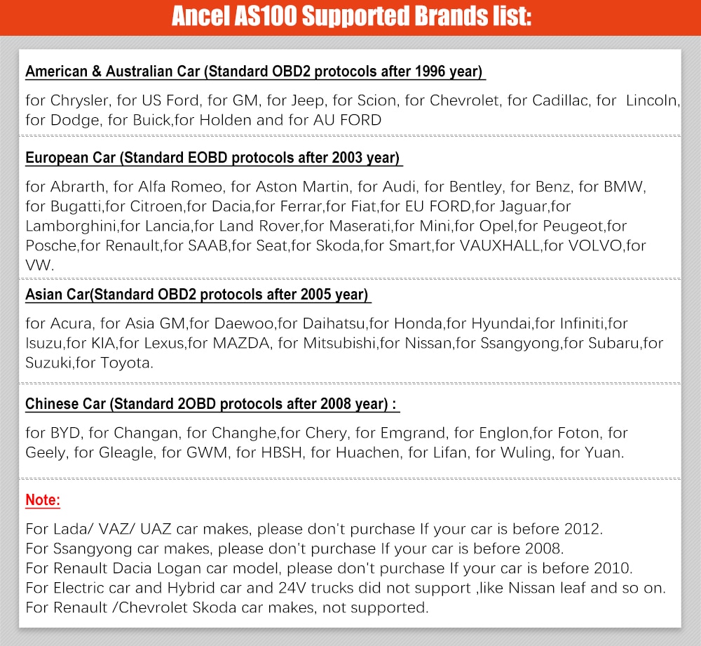 - Ancel AS100 works for most US vehicles after 1996 (12V, 16Pin)