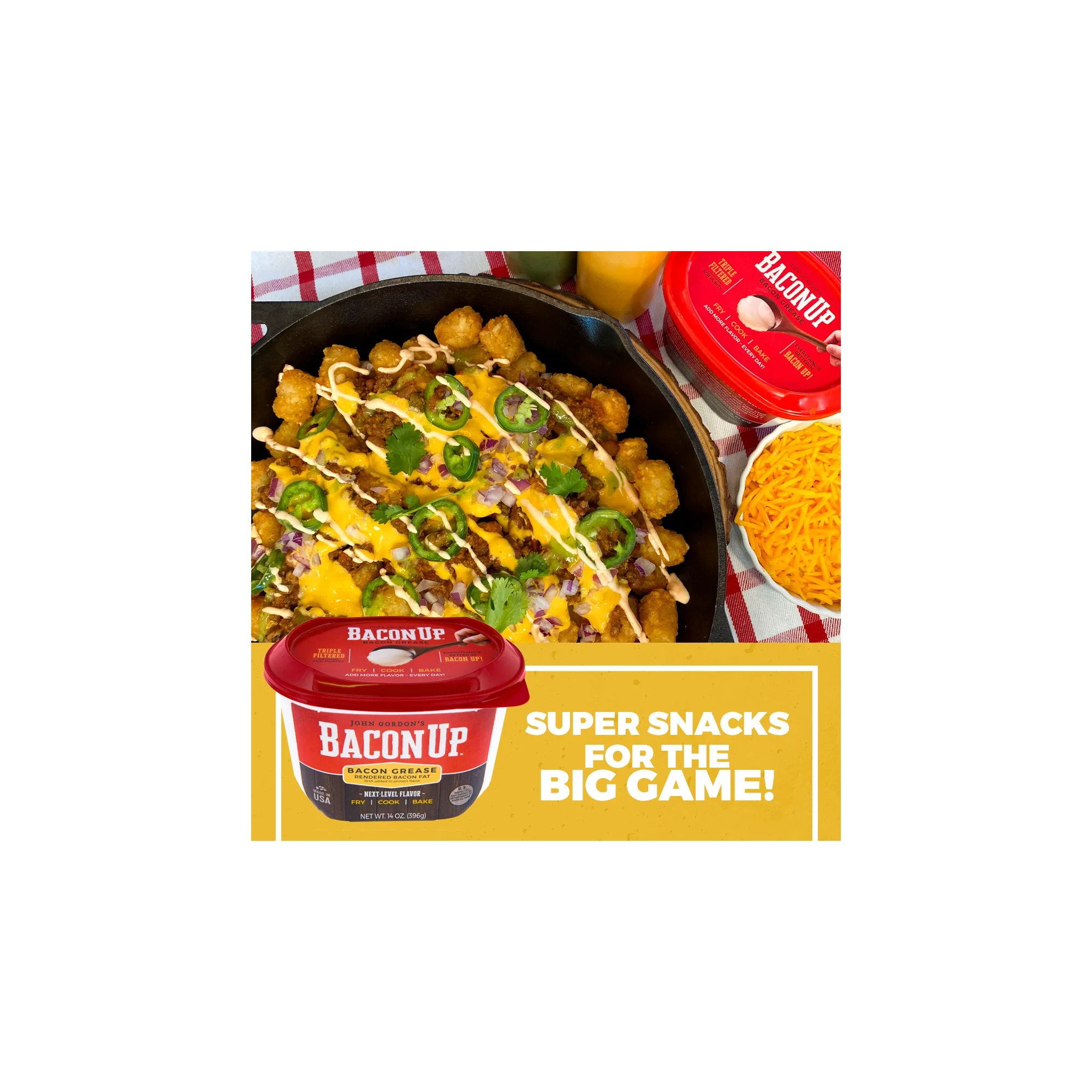 14 Ounce Bacon Up Bacon Grease – Rendered bacon fat that has been tripled filtered for purity. Use Bacon Up in place of butter, shortening or any cooking oil and start a flavor revolution. Bacon Up adds more flavor to everything.Triple Filtered; Convenient 14 ounce reclosable tub; No refrigeration required; Recycle Packaging;