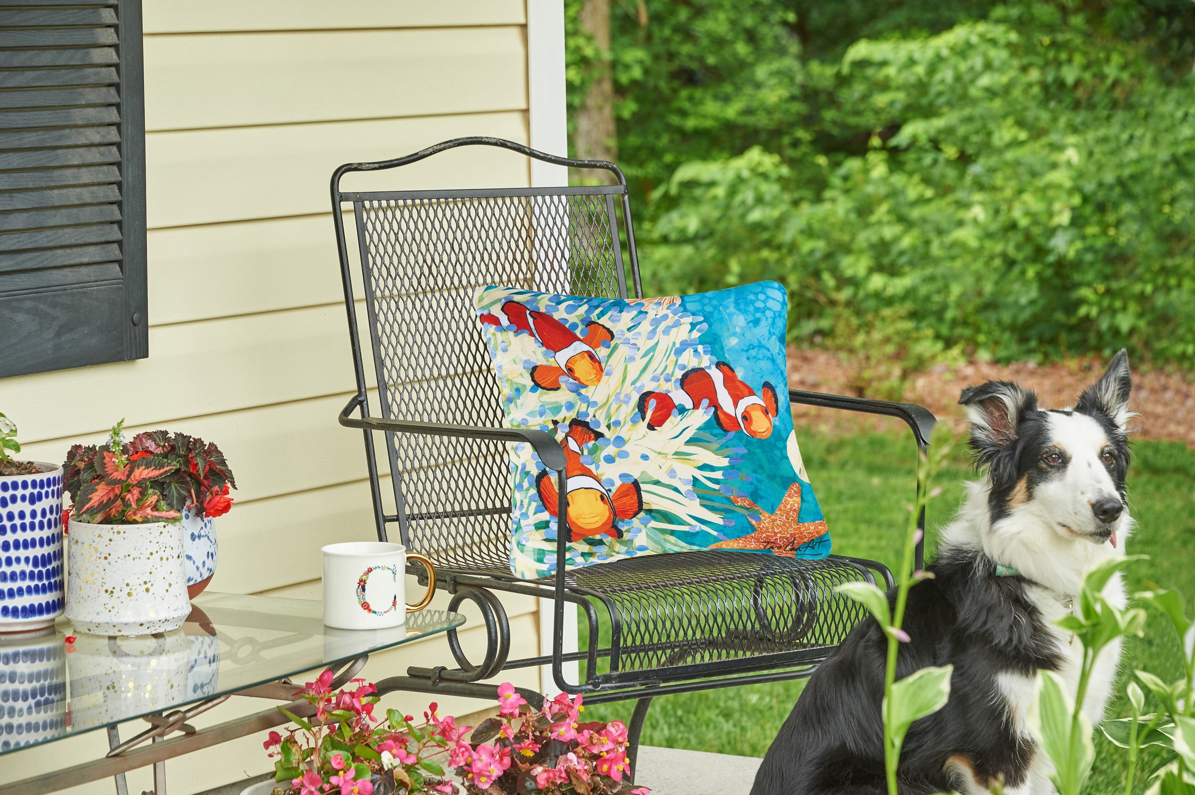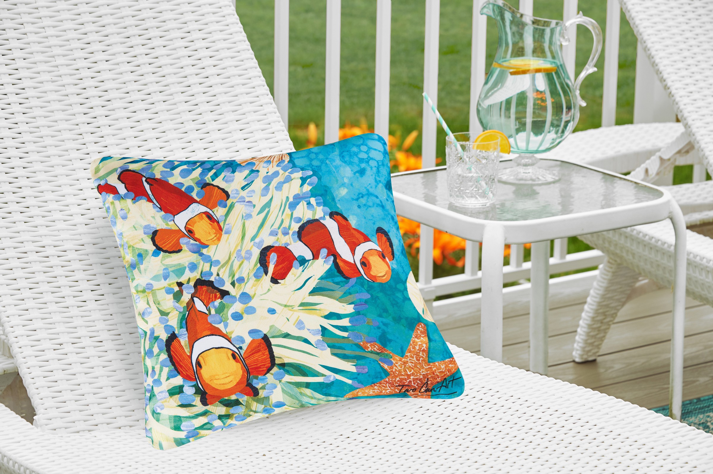 Explore the magic of the ocean with this stunning indoor/outdoor Coral Reef pillow designed in collaboration with licensed artists and mother/son duo, Two Can Art. In a vibrant colorway, cheerful clown fish frolic among coral and shells in the tropical blue sea. Fade-resistant this pillow is crafted with a soft woven polyester cover and plush polyfill for quick drying. The Coral Reef pillow sits comfortably both indoors and out bringing the perfect finishing touch to your coastal decor. Filled and finished in the USA.