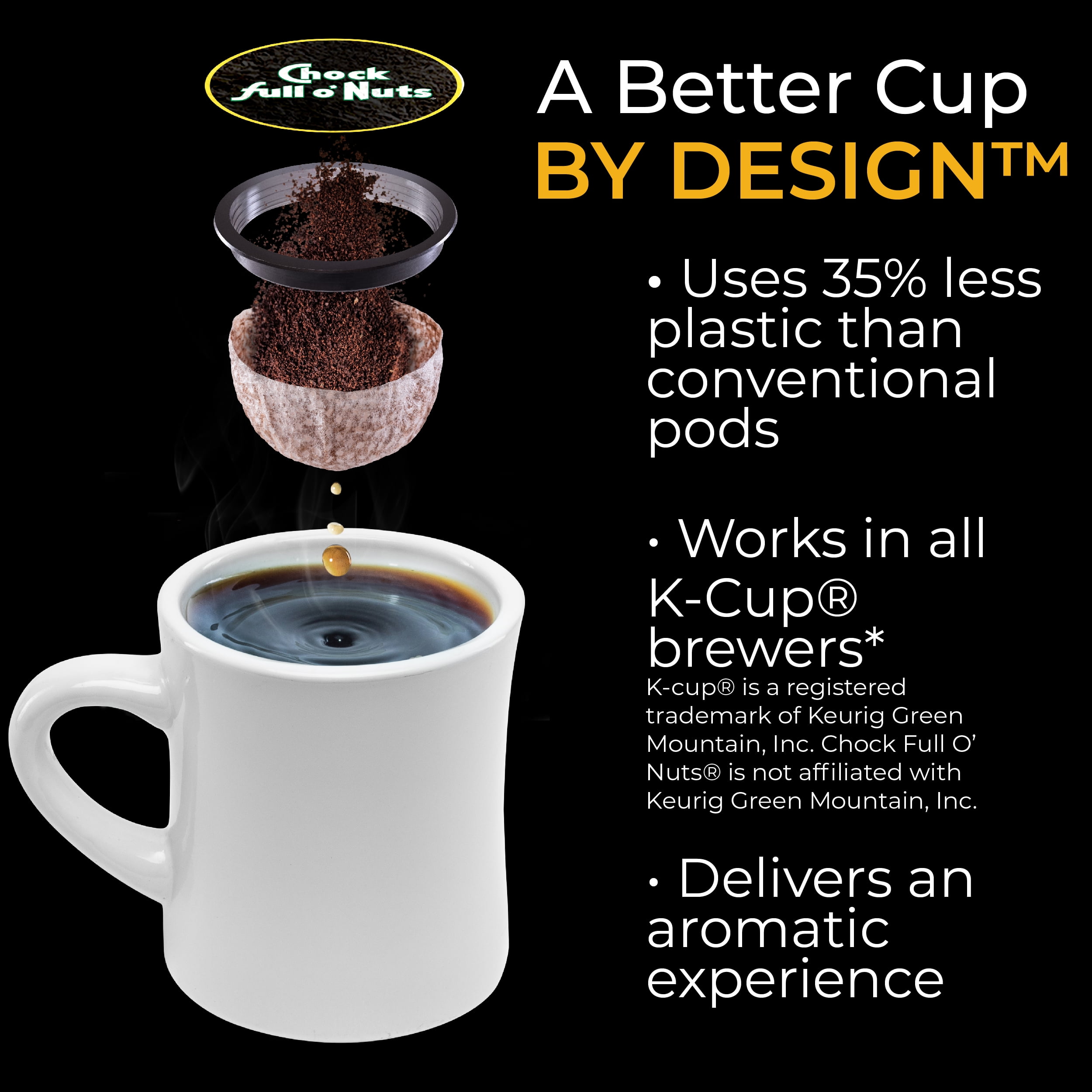 Starting from our first coffee shop on Broadway in New York City, Chock full oâNuts has been roasting perfectly flavored, aromatic coffee for nearly 100 years. Even though we use 35% less plastic than traditional molded plastic coffee pods, the rich aroma & taste are not compromised! Now you can enjoy an amazing cup of coffee day or night with our easy-to-use, single-serve pods.
