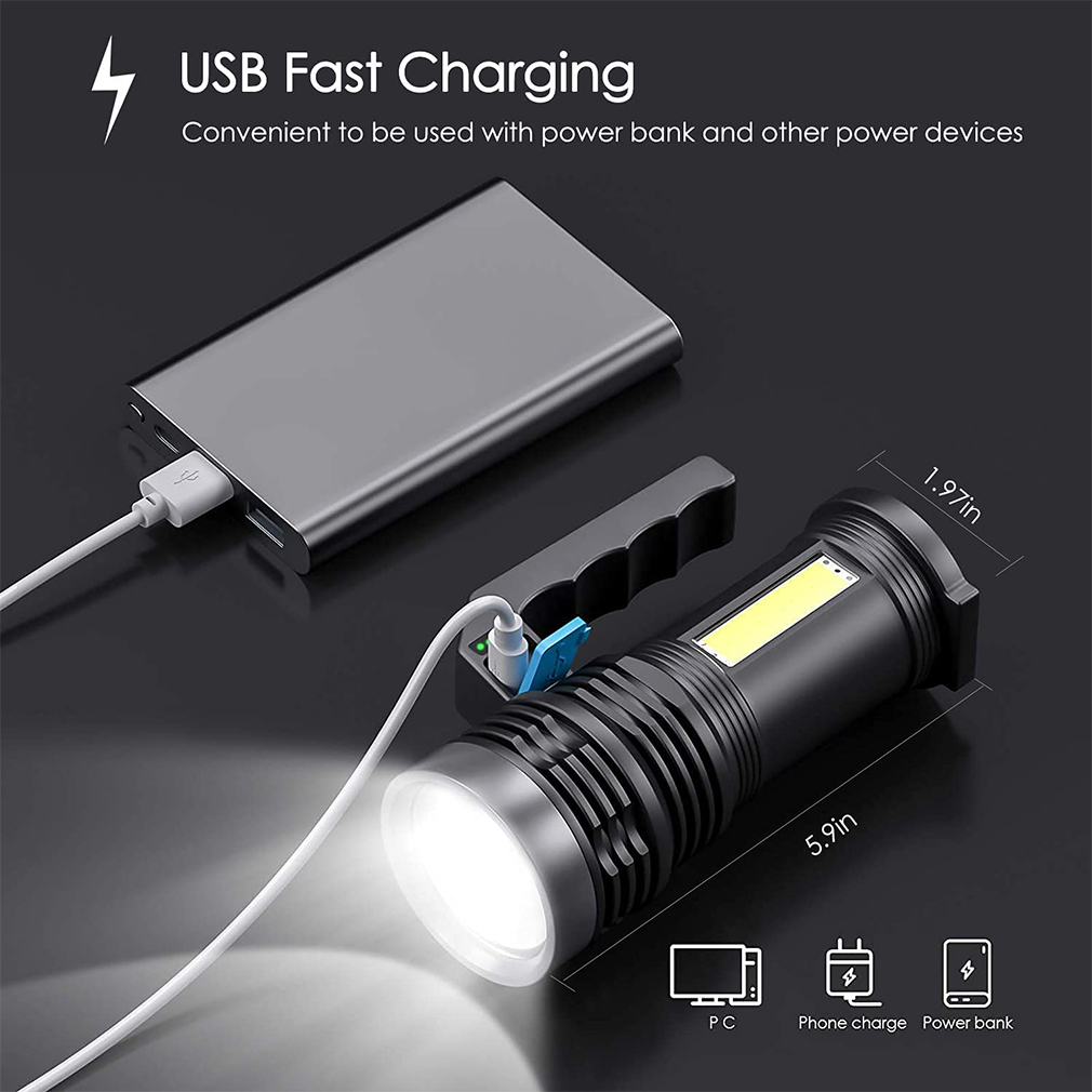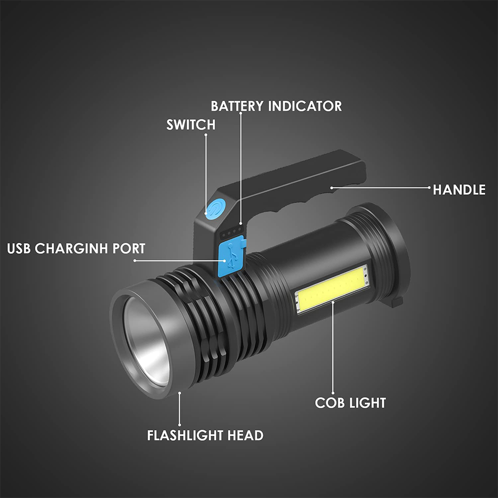 The led flashlight has three brightness levels (high-low-flashing), and equipped with cob side searchlight modes,which can be adjusted according to different conditions, is suitable for family emergencies, typhoons, power outage maintenance, car maintenance, manual reading at night, evening walks, camping, hiking, adventure, and fishing various scenes.