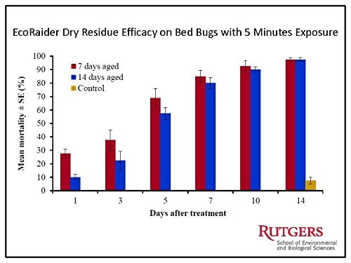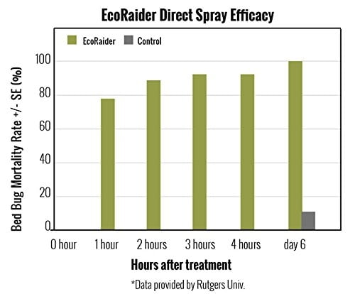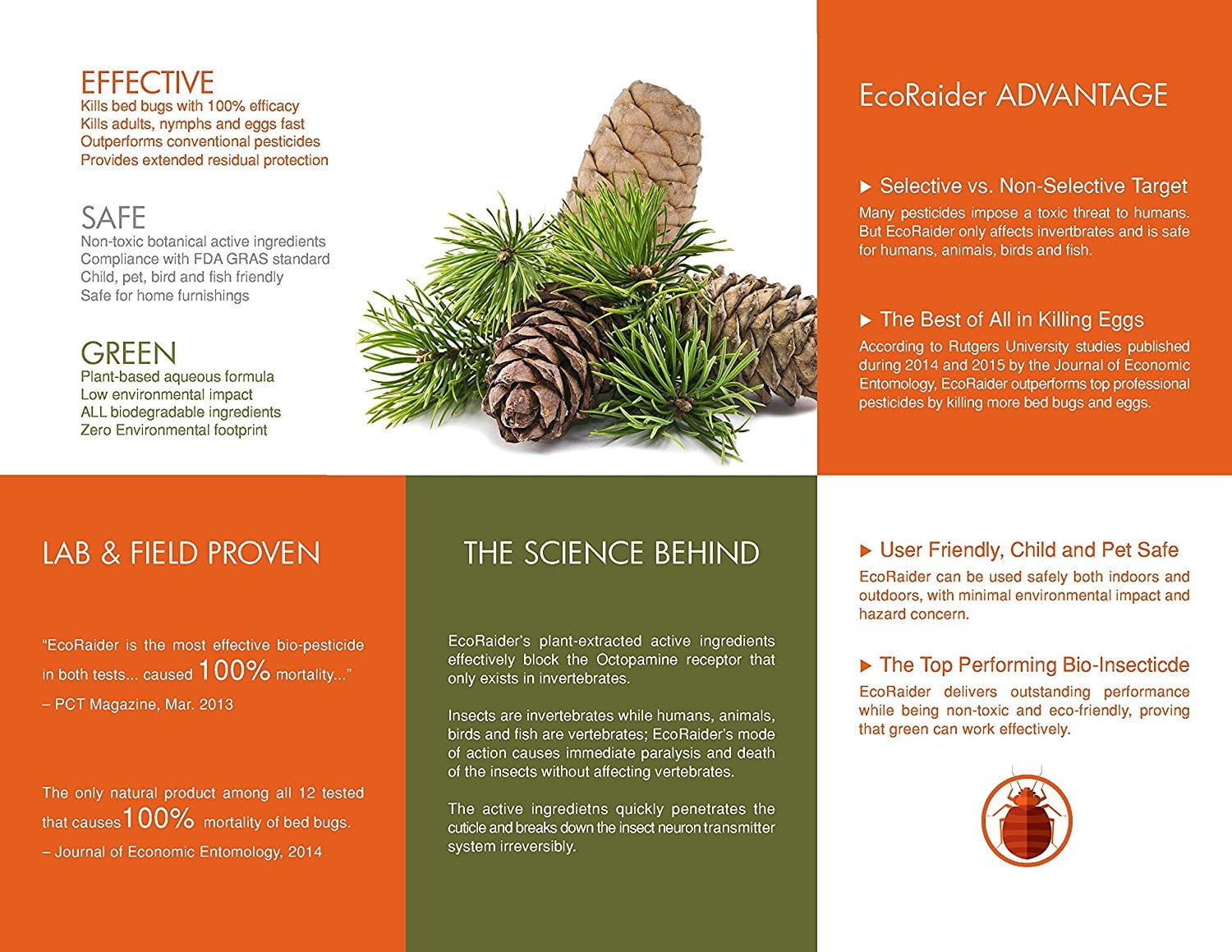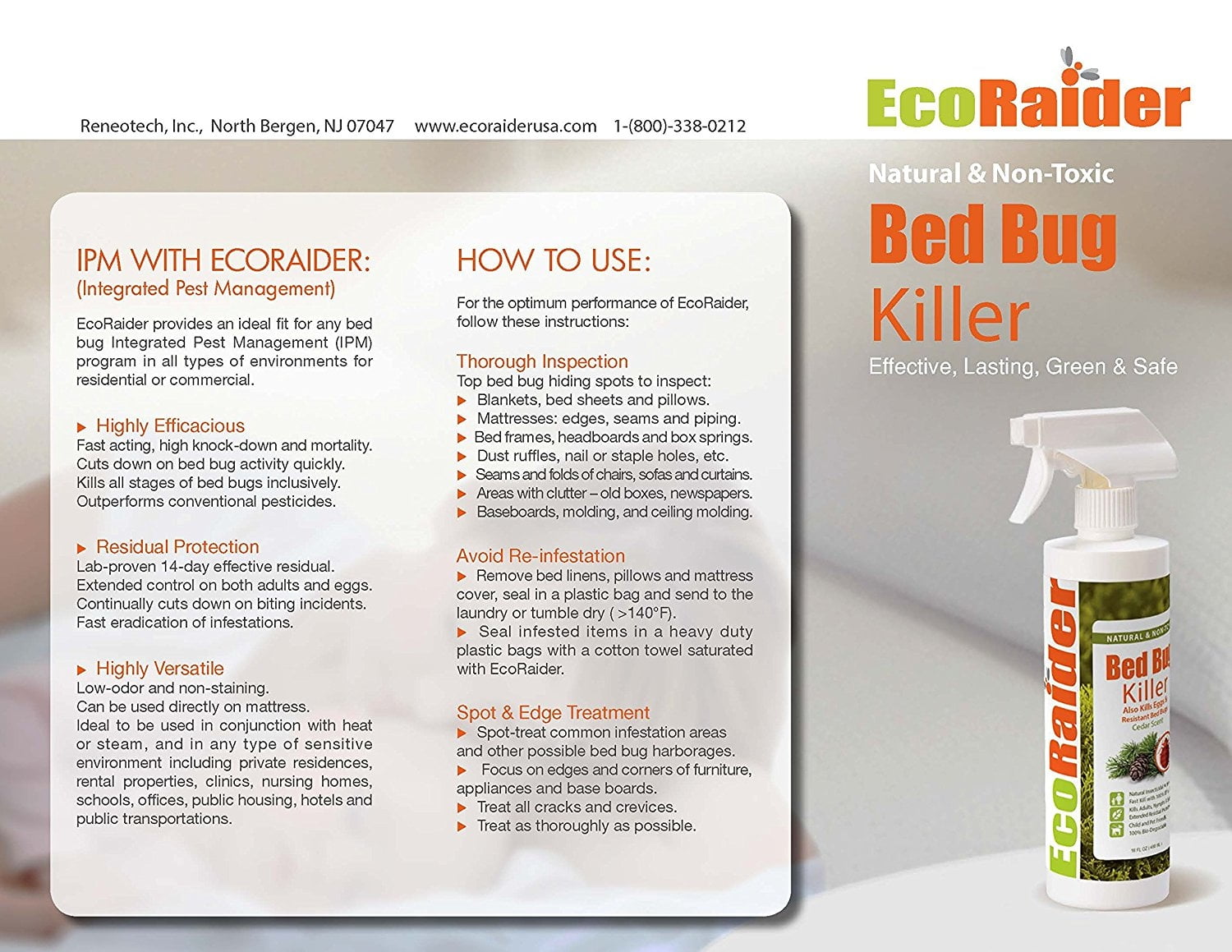 EcoRaider eliminates bed bugs and their eggs fast while providing extended protection after the treatment. #1 Top performance proven in a published university study According to the Rutgers University independent study published in the Journal of Economic Entomology, after testing 12 products, EcoRaider was the only natural product that achieved 100% mortality of bed bugs. In that same study, EcoRaider was also the most effective product of all in eliminating bed bug eggs. EcoRaider not only eliminates bed bugs fast and thoroughly on contact, it provides an extended dry residual for two weeks post treatment. Studies have shown that EcoRaider’s two-week aged dry residual is still 97% effective in eliminating bed bugs! Another published university study demonstrated that EcoRaider outperforms most top grade professional products. EcoRaider is a botanical-based insect neuron blocker that results in fast mortality target insects, but safe for children and pets.EcoRaider only contains ingredients that are generally recognized as safe. According to Product Safety Lab testing, EcoRaider causes none to minimal skin irritation. EcoRaider can be used in sensitive environments such as schools, clinics, health-care facilities and public areas. Three-Step Easy Bed Bug Elimination! STEP1: PREPARATION Transfer linens, mattress covers and clothing in a poly bag to a tumble dryer. If care label allows, dry on the highest setting (140 °F) for 30 minutes. STEP2: TREAT BEDDING Spray all sides of the bed frame and head board; all edges and seams of the mattress and box spring; any edge, corner, joint, nook and cranny. STEP3: TREAT SURROUNDING Thoroughly spray the surrounding area including night stands, chairs and sofas; curtain folds, baseboards, crown moldings; edge of carpet and any cracks and crevices.EcoRaider Bed Bug Killer Spray 16 Oz, Green + Non-toxic, 100% Kill + Extended Protection