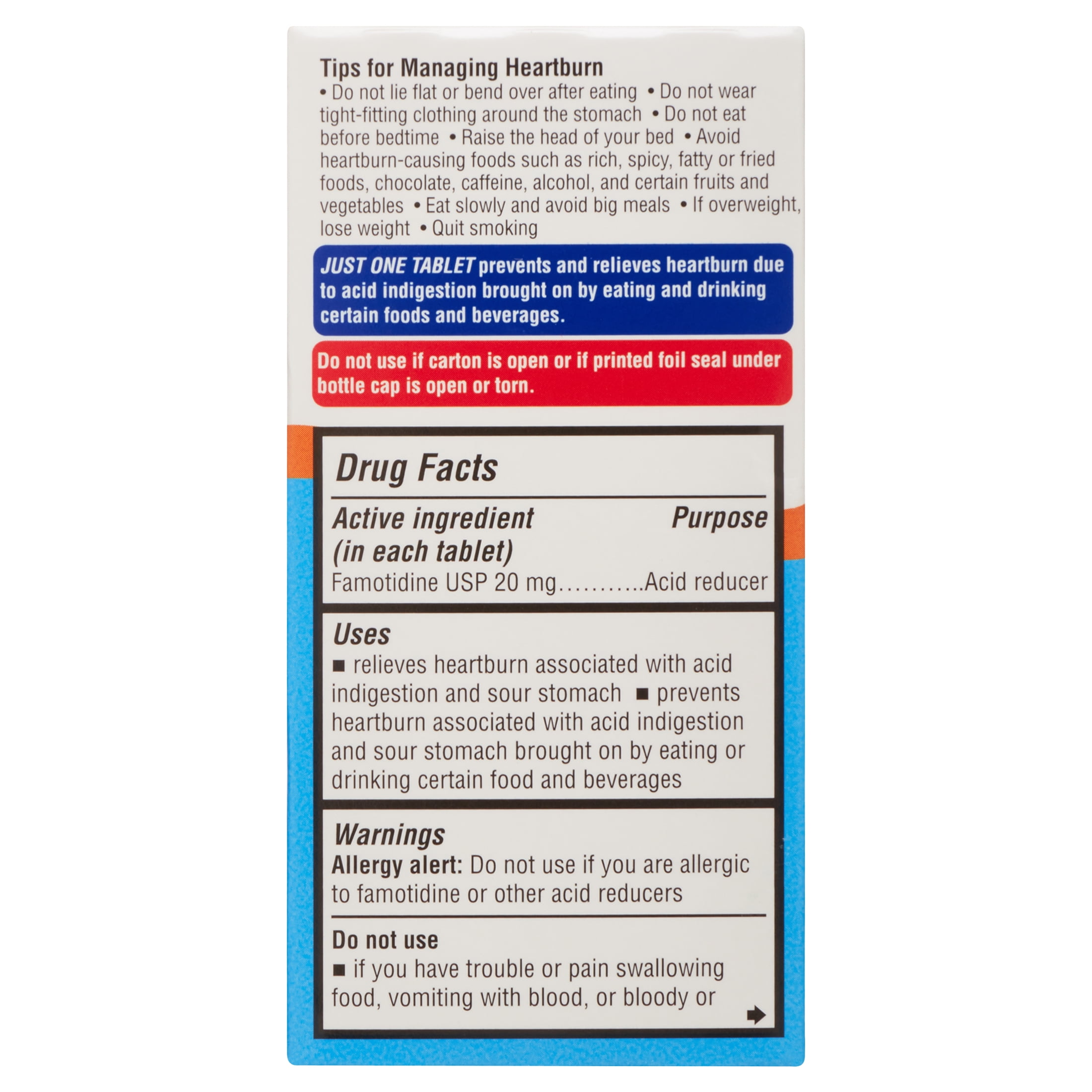 - Active ingredient (in each tablet): Famotidine USP 20 mg (acid reducer)
