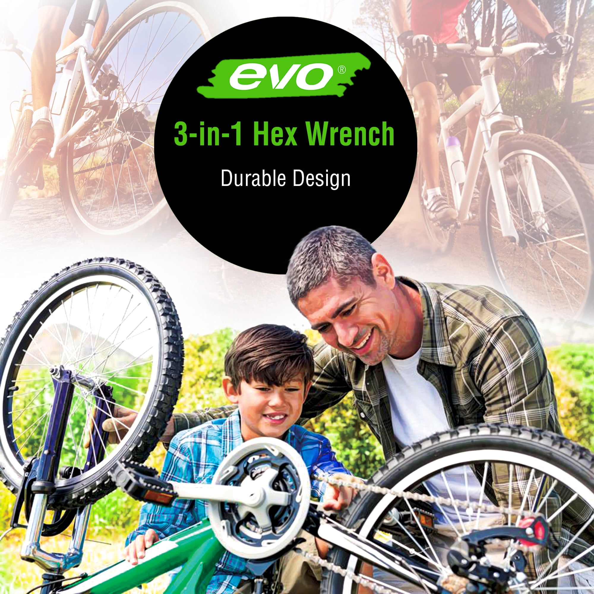 EVO YT-1 Hex Y-Wrench Road Bike Multi Tool – 4mm, 5mm, and 6mm Bicycle Hex Wrench – 3-Way Wrench Hex Tool for Most Common Sizes of Hex Bolts on Road Bikes, Mountain Bikes and Scooters EVO YT-1 Hex Y-Wrench SetEVO’s road bike multi tool is comfortable to hold while using. Each hex wrench is the perfect length for achieving leverage during bike repairs.Sizes: 4, 5, and 6mmThe bicycle hex wrench set includes 3 hex tools in one. At EVO, we create bikes and bicycle parts and this hex tool fits the majority of hex bolts found on a bicycle, but this set can be used for repairs and adjustments of scooters, guitars, furniture, automobiles, and more.EVO BicycleEVO is all about versatility and fun. We carry bicycle parts that you need for cruisers, comfort bikes, youth bicycles, road bikes, trailblazing, mountain bikes, e-bikes, and more! At EVO, what motivates us is the simple joy a bicycle provides. We also believe that not every cyclist is an enthusiast, so we make bikes and accessories that won’t come at the expense of the other things you like to do in life. All EVO branded components are made of high-quality materials so you can rest assured that they are made to last.
