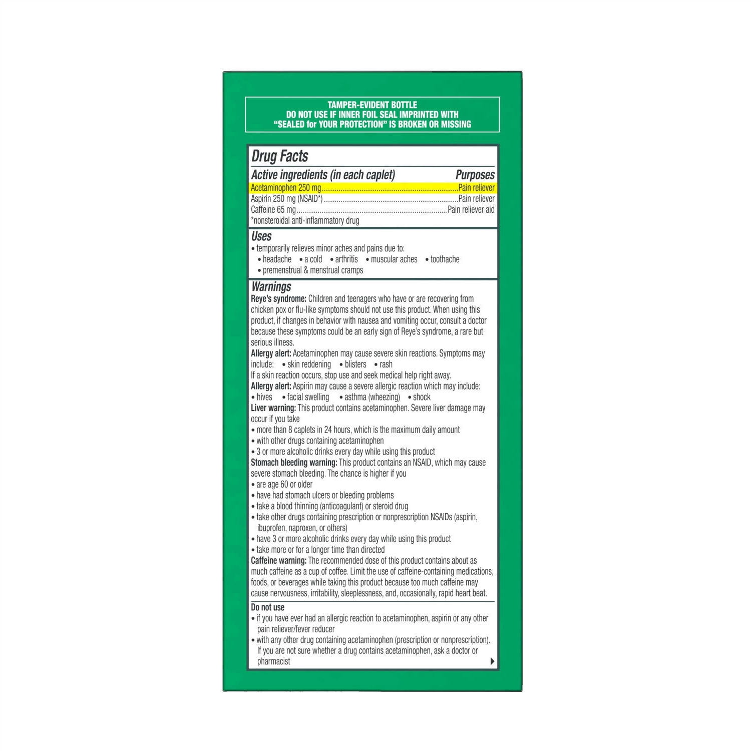 Excedrin Extra Strength Caplets are pain relievers that provide clinically proven, fast acting headache relief. These convenient Excedrin caplets work as hard as you do, combining aspirin and acetaminophen with caffeine. These active ingredients create a powerful formula with two pain fighters and a booster to offer temporary relief of pain from headaches, colds, premenstrual and menstrual cramps, arthritis, tooth pain and muscle pain. For some, headache pain relief with this Excedrin extra strength pain reliever can start in 15 minutes.One bottle of 200 Excedrin Extra Strength CapletsExtra strength pain reliever that relieves pain associated with headache, colds, menstrual cramps, toothaches, muscular aches and arthritisPain medicine that is a clinically proven headache pain relieverExcedrin Extra Strength caplets contain two pain fighters and a booster for enhanced effectPain reliever available in convenient caplet formFor some, headache relief can start in 15 minutesHSA and FSA eligible item
