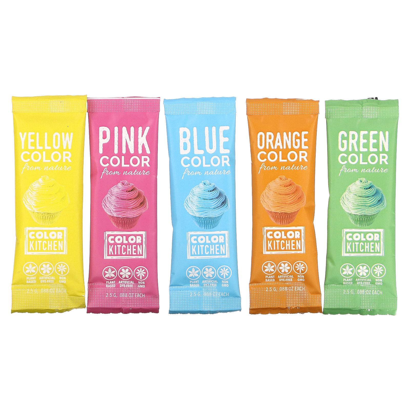 Plant Based Artificial Dye Free Non GMO Gluten Free Vegan Ink Pastel To Deep Rich Colors Contains : 2 Blue 2 Pink 2 Yellow 2 Orange 2 Green 1 Color Packet Enough to color a pint of frosting. Colors are twice as saturated in icing. Color Mixing Per Pint of Frosting Mint – 1/4 blue packet / 1/4 yellow packet Lime – 1/4 blue packet / 1 yellow packet Sky Blue – 1/2 blue packet Forest – 1 green packet / 1/2 blue packet Turquoise – 1 blue packet / 1/2 green packet Purple – 1 pink packet / 1 blue packet Lavender – 1/4 pink pink packet / 1/4 blue packet Coral – 1/4 pink packet / 1/4 yellow packet Peach – 1/2 pink packet / 1/2 yellow packet Red – 1 pink packet / 1/2 orange packet