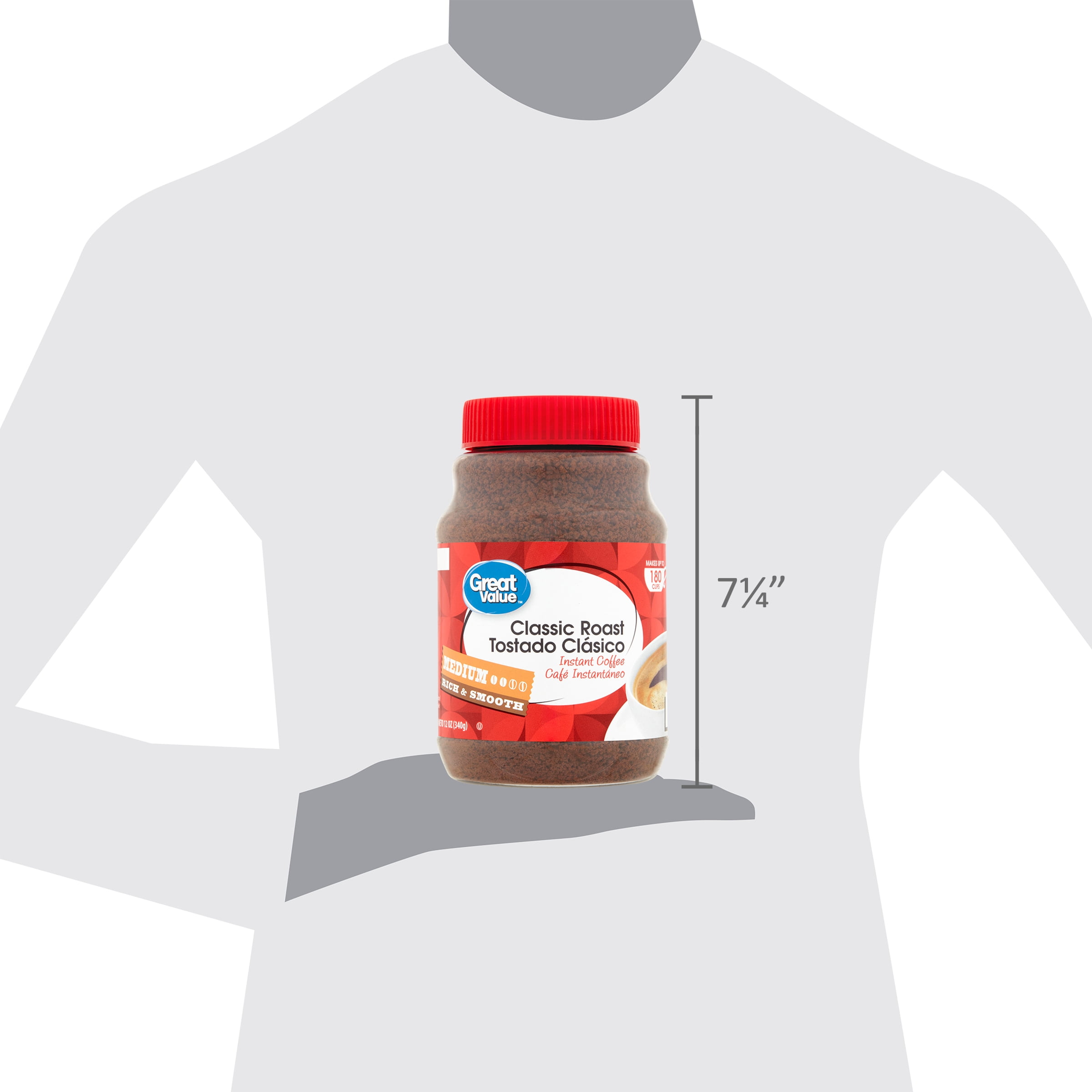 Save money by skipping the coffee shop and indulging in a cup of Great Value Medium Classic Roast Instant Coffee. The rich and smooth medium blend is instant and ideal for a single serving in a hurry. The suggested brewing instructions follow a simple ratio of one tablespoon of coffee per each 6-ounce cup. This blend is exceptional as an everyday indulgence and affordable enough to buy in bulk for the office. Whether you’re at home or work, the convenience of Great Value Medium Classic Roast Instant Coffee means you’ll have more time to spend on the things in life that matter most.